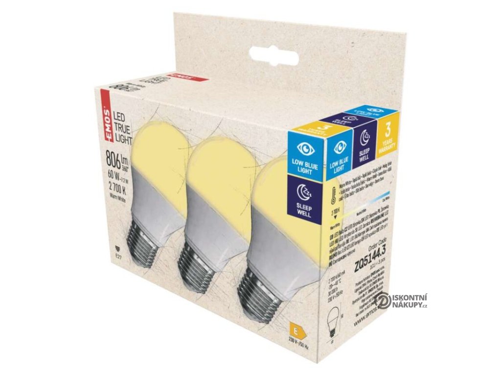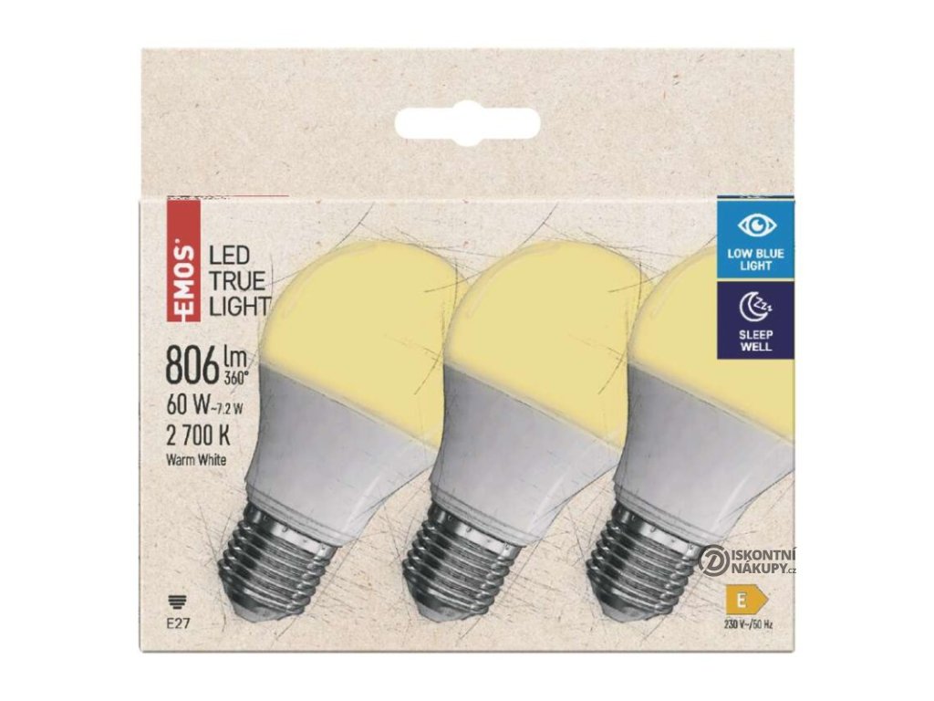 barva světla: teplá bílá|energetická třída: E|index podání barev (CRI): 94|kompatibilita: –|náhrada za žárovku: 60 W|napětí: 230 V~/50 Hz|notifikace do mobilní aplikace: –|ovládání hlasovými asistenty: –|patice (uchycení žárovky): E27|počet čipů: 20|počet spínacích cyklů: 25 000|podporované OS: –|přenosová frekvence: –|příkon: 7,2 W|prodejní obal: 3 ks, krabička|protokol: –|řada: TRUE LIGHT|rozměr: 102 × 60 × 60 mm|stmívatelná: ne|světelná účinnost: 112 lm/W|světelný tok: 806 lm|technologie: LED|teplota chromatičnosti: 2 700 K|tvar: A60|typ čipů: SMD|účiník: 0,57|úhel vyzařování: 180°|záruční doba: 3 roky|životnost: 30 000 hodinVýhody produktu