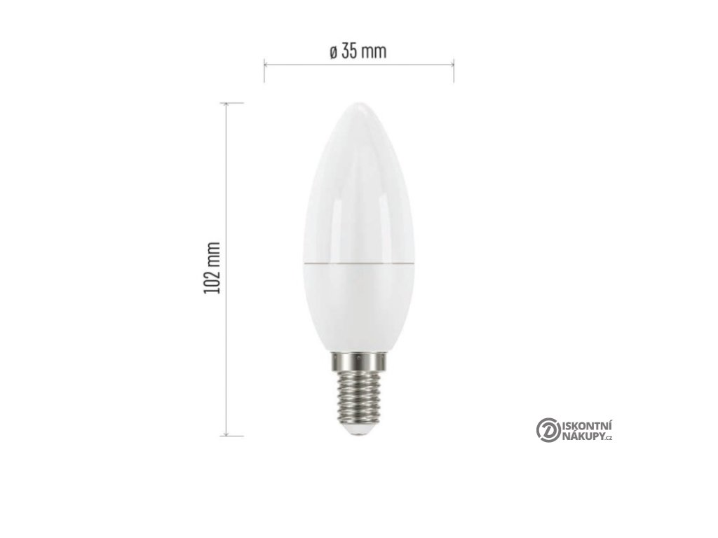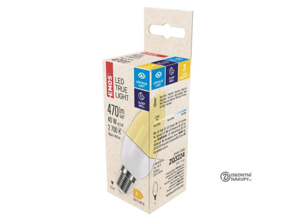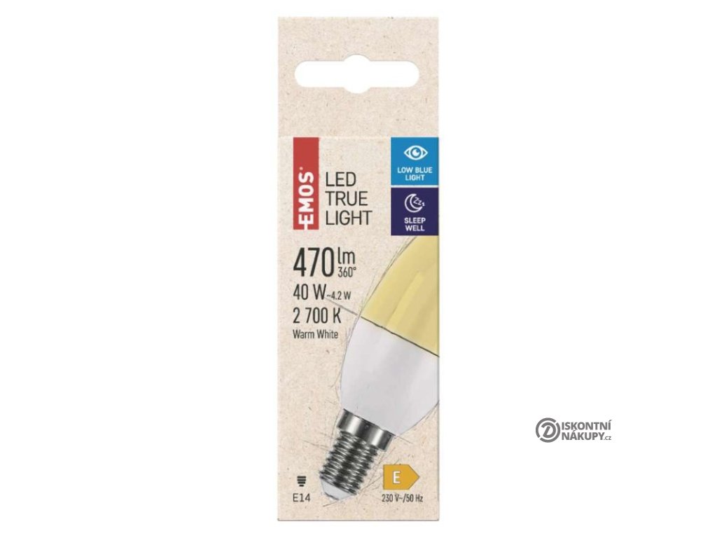 barva světla: teplá bílá|energetická třída: E|index podání barev (CRI): 94|kompatibilita: –|náhrada za žárovku: 40 W|napětí: 230 V~/50 Hz|notifikace do mobilní aplikace: –|ovládání hlasovými asistenty: –|patice (uchycení žárovky): E14|počet čipů: 18|počet spínacích cyklů: 25 000|podporované OS: –|přenosová frekvence: –|příkon: 4,2 W|prodejní obal: 1 ks, krabička|protokol: –|řada: TRUE LIGHT|rozměr: 102 × 35 × 35 mm|stmívatelná: ne|světelná účinnost: 112 lm/W|světelný tok: 470 lm|technologie: LED|teplota chromatičnosti: 2 700 K|tvar: svíčka|typ čipů: SMD|účiník: 0,51|úhel vyzařování: 260°|záruční doba: 3 roky|životnost: 30 000 hodinVýhody produktu