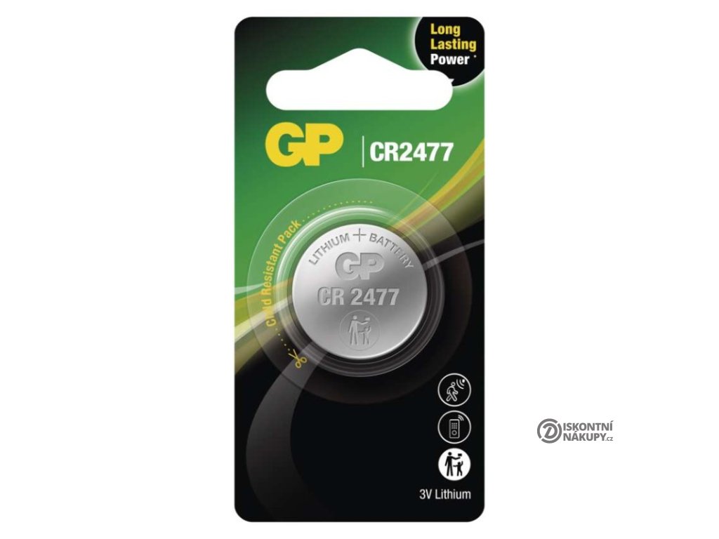 chemické složení: lithiové|hmotnost: 6,6 g|kapacita: 590 mAh|kategorie/řada: Lithium|max. skladovatelnost: 10 let|možnost nabíjení: ne|napětí: 3 V|počet nabíjecích cyklů: nenabíjecí|prodejní obal: 1 ks, blistr|provozní teplota: -20 °C až +60 °C|rozměr: 24,5 × 7,7 mm|typ: GP CR2477|velikost baterie: neuvádí se|značka: GPDoplňkové parametry