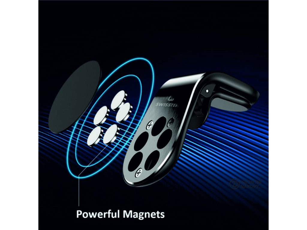 Kovový magnetický držák do auta v elegantním designu. Jedná se o jeden z nejtenších držáků do auta. Je opatřen pěti magnety pro lepší zabezpečení telefonu. Pogumovaný povrch ochrání telefon před poškrábáním a zamezí možnost skluzu telefonu. Pevný stisk čelistí v kombinaci s nano podložkou zabezpečí držák proti vysunutí z mřížky. Baleno v blistru Swissten.