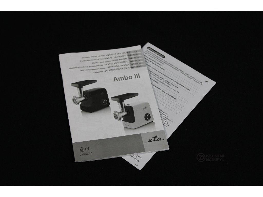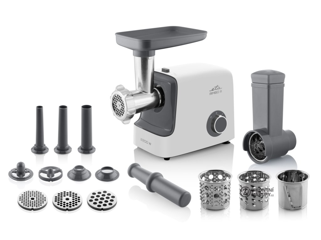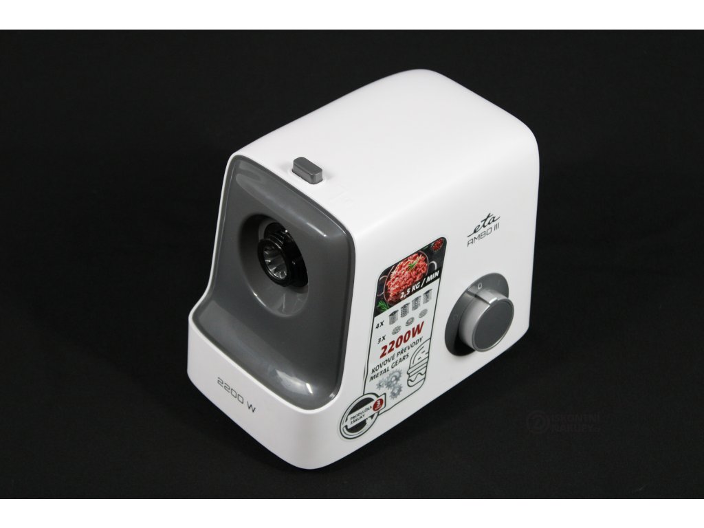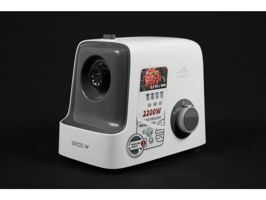 Nový a vylepšený elektrický mlýnek na maso ETA Ambo III se pyšní skvělým výkonem 2 200 W a 2 rychlostmi mletí. Kvalitní převodová kola i kovová mlecí komora zaručují dlouholetou životnost přístroje. Díky odolnému nerezovému mlecímu noži a mlecím destičkám se můžete pustit do zpracování jakéhokoliv masa.