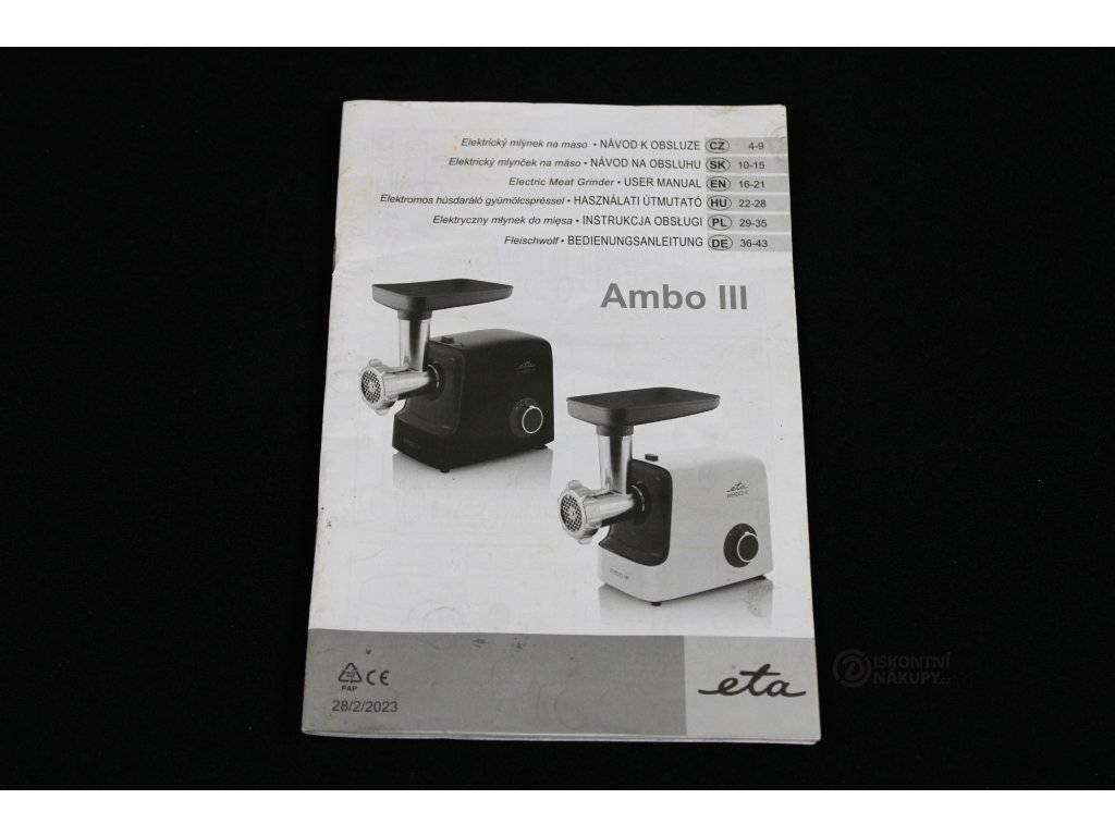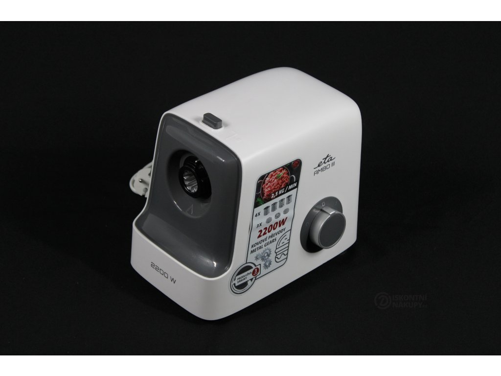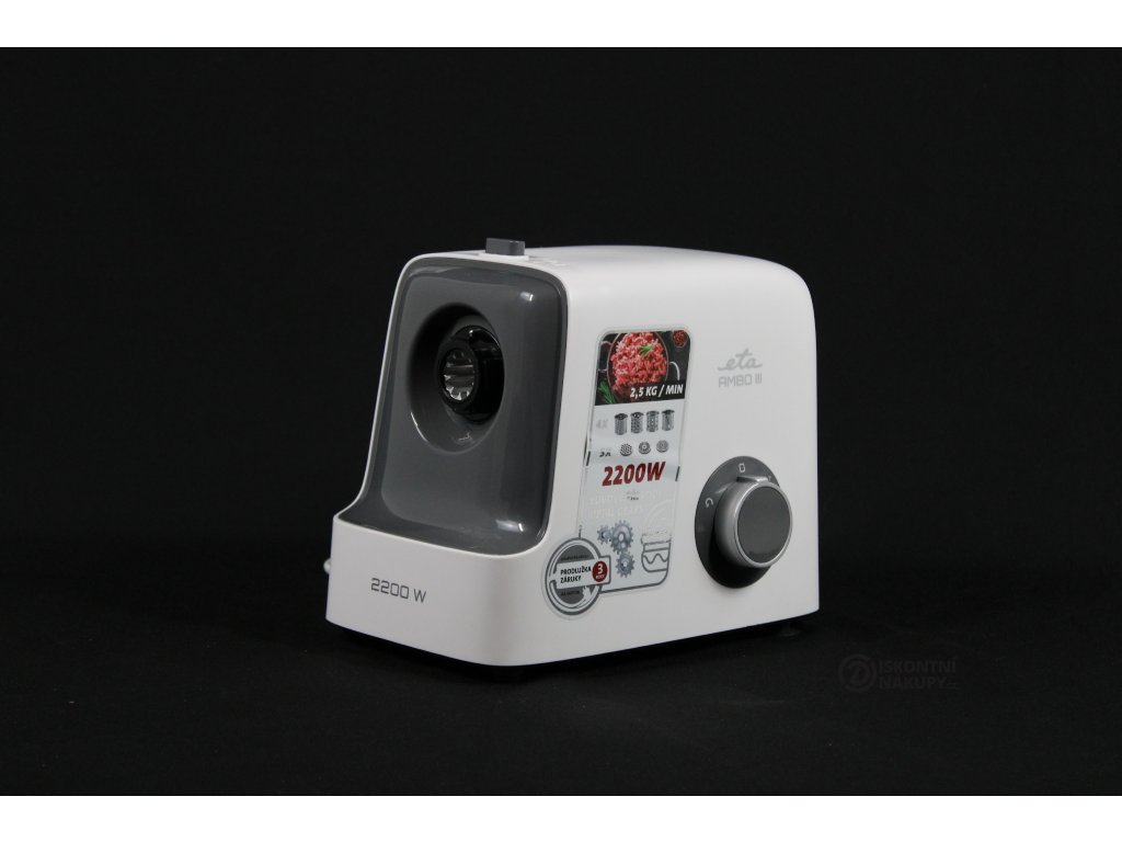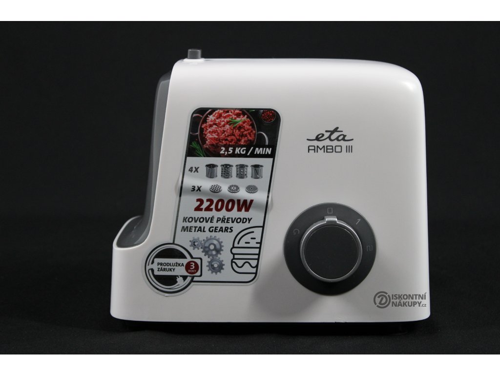 Nový a vylepšený elektrický mlýnek na maso ETA Ambo III se pyšní skvělým výkonem 2 200 W a 2 rychlostmi mletí. Kvalitní převodová kola i kovová mlecí komora zaručují dlouholetou životnost přístroje. Díky odolnému nerezovému mlecímu noži a mlecím destičkám se můžete pustit do zpracování jakéhokoliv masa.
