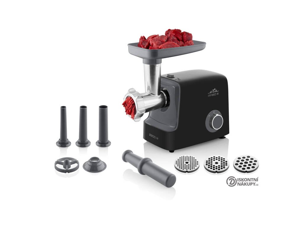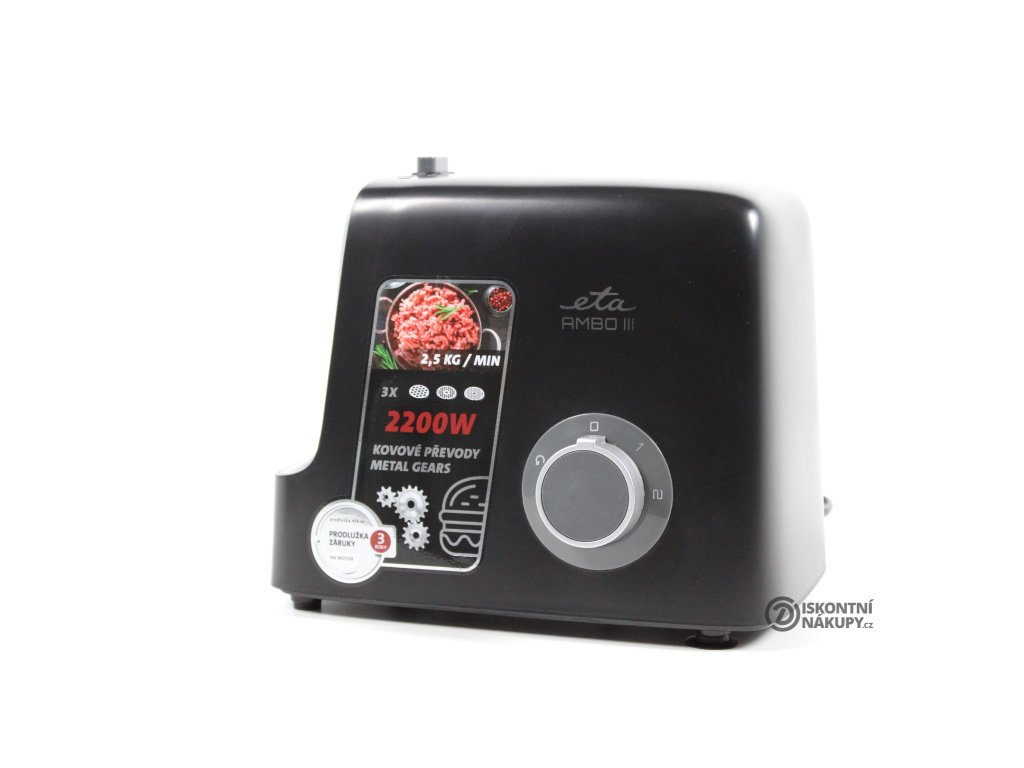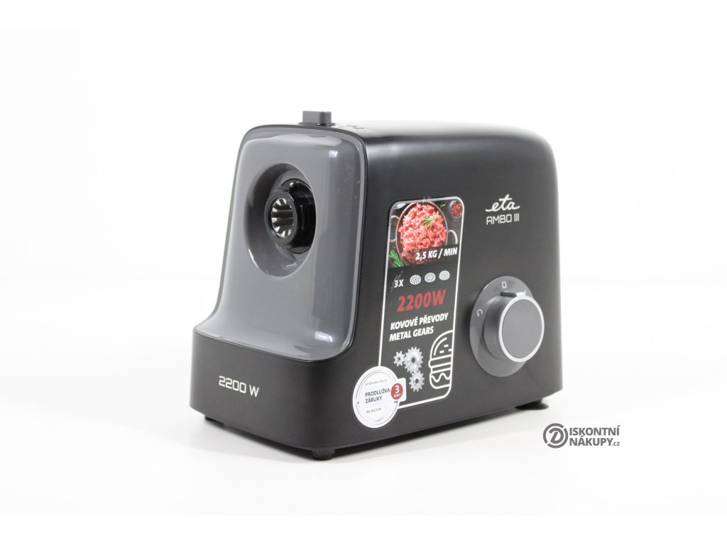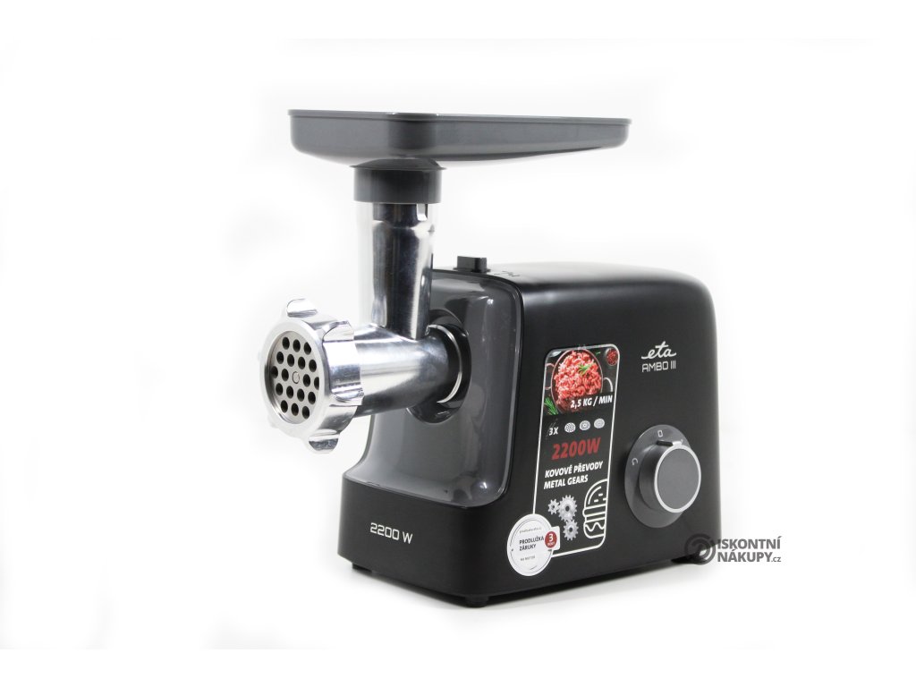 Nový a vylepšený elektrický mlýnek na maso ETA Ambo III se pyšní skvělým výkonem 2 200 W a 2 rychlostmi mletí. Kovová převodová kola i kovová mlecí komora zaručují dlouholetou životnost přístroje. Díky odolnému nerezovému mlecímu noži a mlecím destičkám se můžete pustit do zpracování jakéhokoliv masa.
