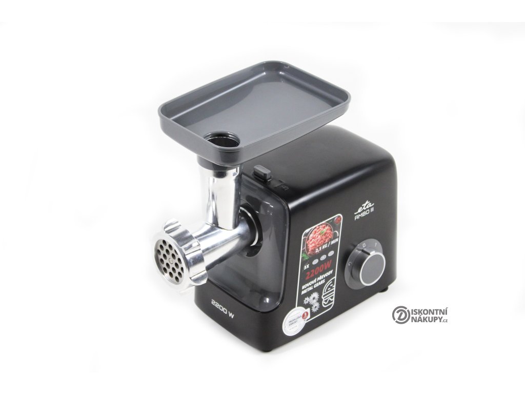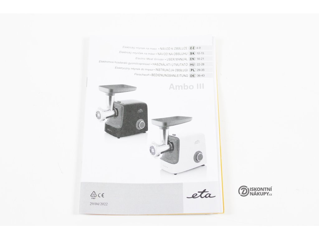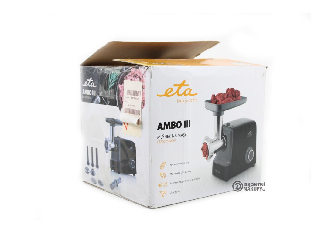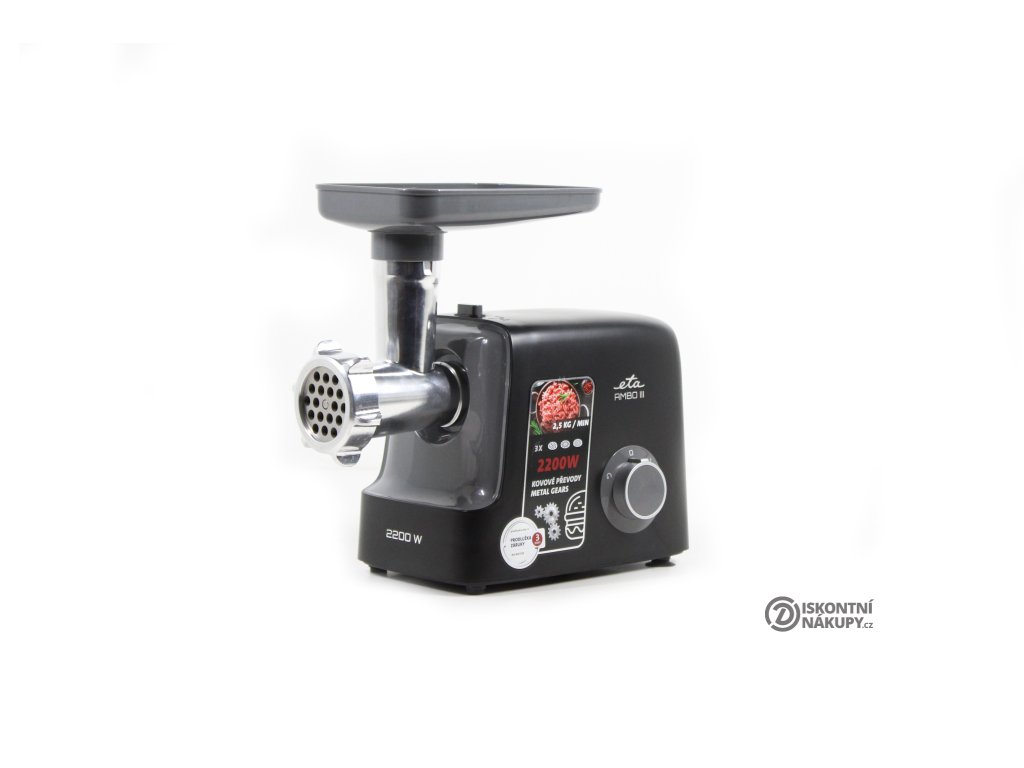 Nový a vylepšený elektrický mlýnek na maso ETA Ambo III se pyšní skvělým výkonem 2 200 W a 2 rychlostmi mletí. Kovová převodová kola i kovová mlecí komora zaručují dlouholetou životnost přístroje. Díky odolnému nerezovému mlecímu noži a mlecím destičkám se můžete pustit do zpracování jakéhokoliv masa.