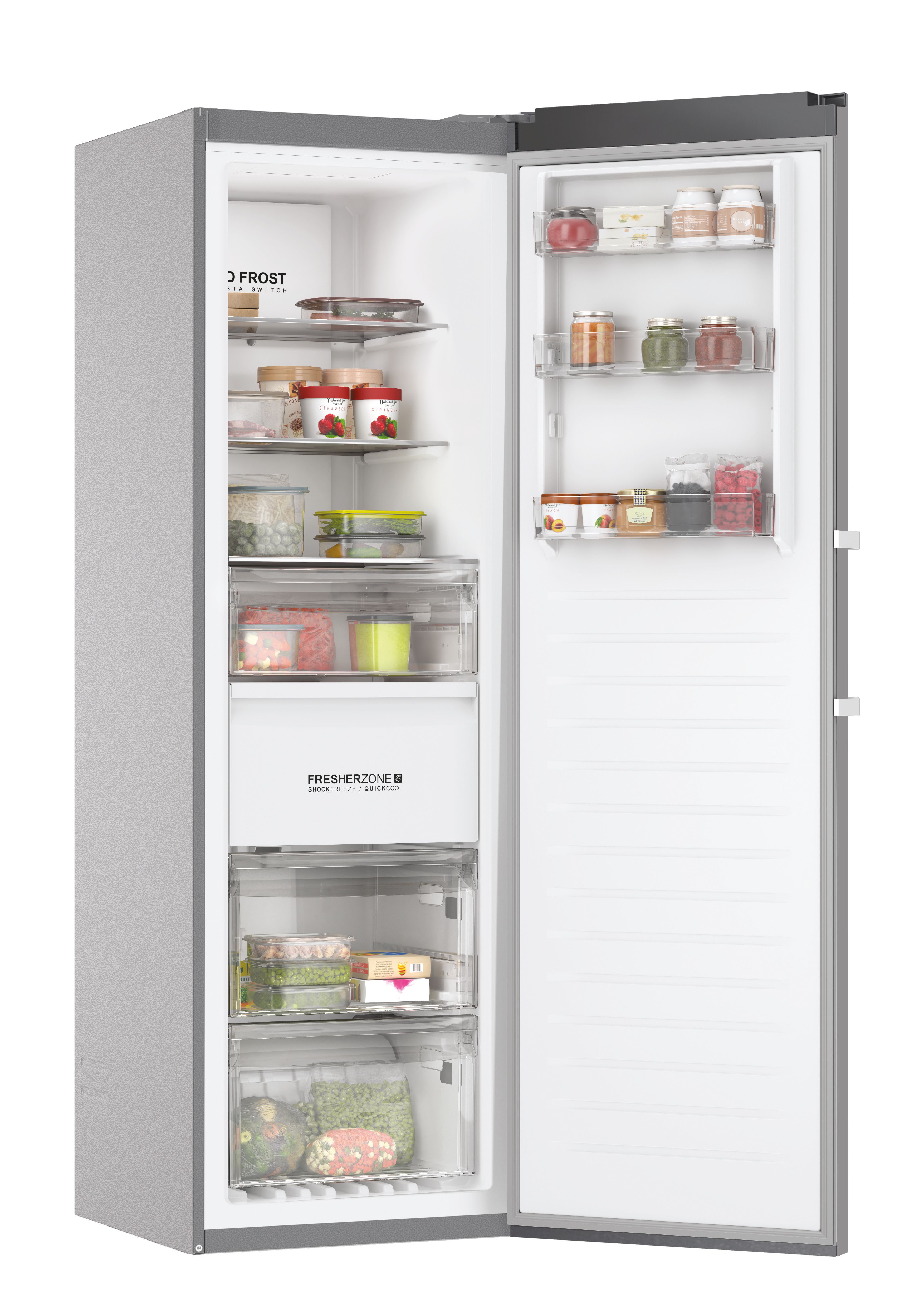 Zásuvkový mrazák/chladnička Instaswitch H3F330SEH1 s kapacitou 330 litrů nabízí nejen XL vnitřní prostor s praktickým uspořádáním, ale také nejnovější technologie, výkon a pohodlí. Jeho výjimečnost tkví v možnosti použití jako klasický mrazák s teplotou až -24 °C nebo jej přepnete na chladničku s teplotou uvnitř +4 °C, to vše podle vašich aktuálních potřeb. Technologie Total No Frost zabrání tvorbě námrazy a špičkový invertorový kompresor se zárukou 12 let zaručí velmi tichý chod. K dalším přednostem patří akustický signál otevřených dvířek, akustický a světelný signál zvýšené teploty a velmi praktická zásuvka Fresher Zone pro šokové chlazení či mrazení. Nejnovější technologií je Wifi + Bluetooth připojení s možností ovládání přes aplikaci hOn a získáním doplňkových funkcí.