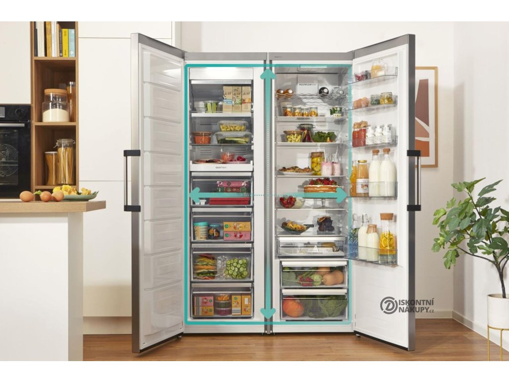 Větší skladovací kapacita odráží trendy v moderních chladicích zařízeních. Je to nejlepší řešení pro skladování velkého množství potravin. Větší kapacita umožňuje lepší organizaci vašich potravin, poskytuje lepší přehled o tom, co se ve spotřebiči nachází, což má za následek i snížení plýtvání potravinami. Uskladnění většího množství potravin také znamená méně časté nakupování a více času pro vás.