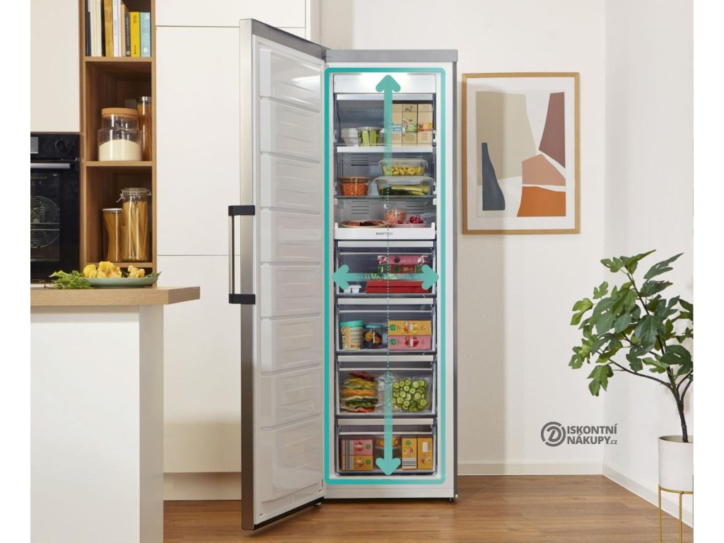 Intenzivní cirkulace chladného vzduchu odstraňuje vlhkost ze stojaté mrazničky. To zabraňuje hromadění námrazy na potravinách a ledu na vnitřních stěnách a udržuje nízkou spotřebu energie. Výsledkem je optimální využití skladovací kapacity a odmrazování a čištění vnitřního prostoru již není nutné. Balíčky nebo kusy zmrazených potravin se k sobě nelepí, takže potraviny v mrazničce zůstávají čisté a přehledné.