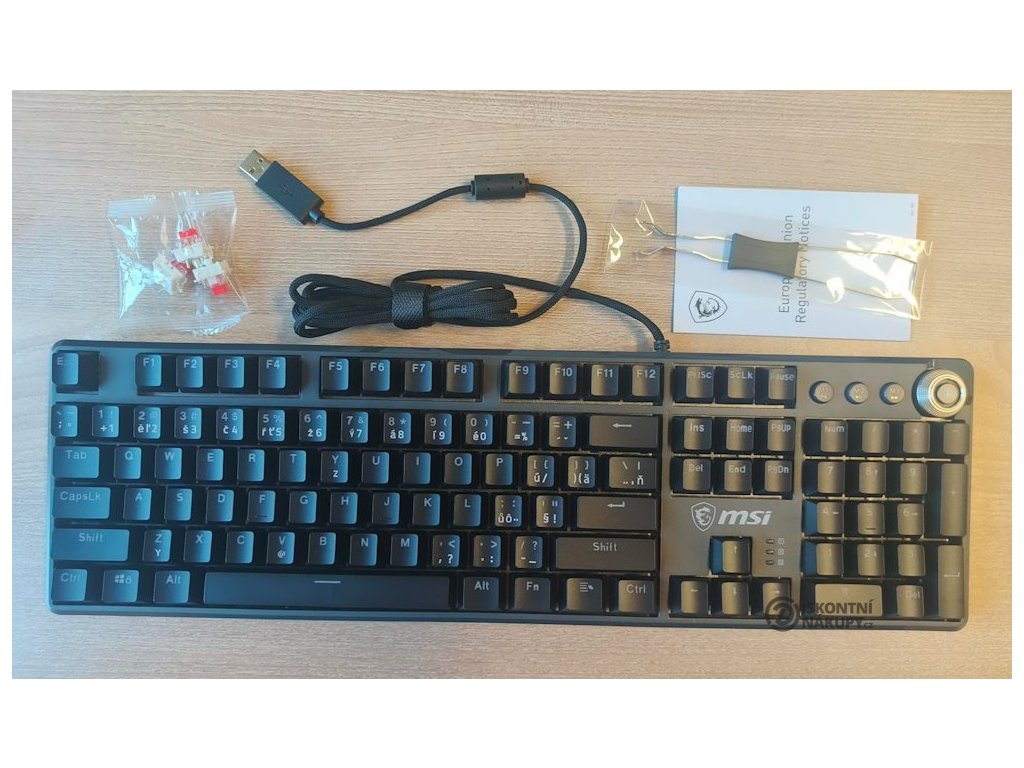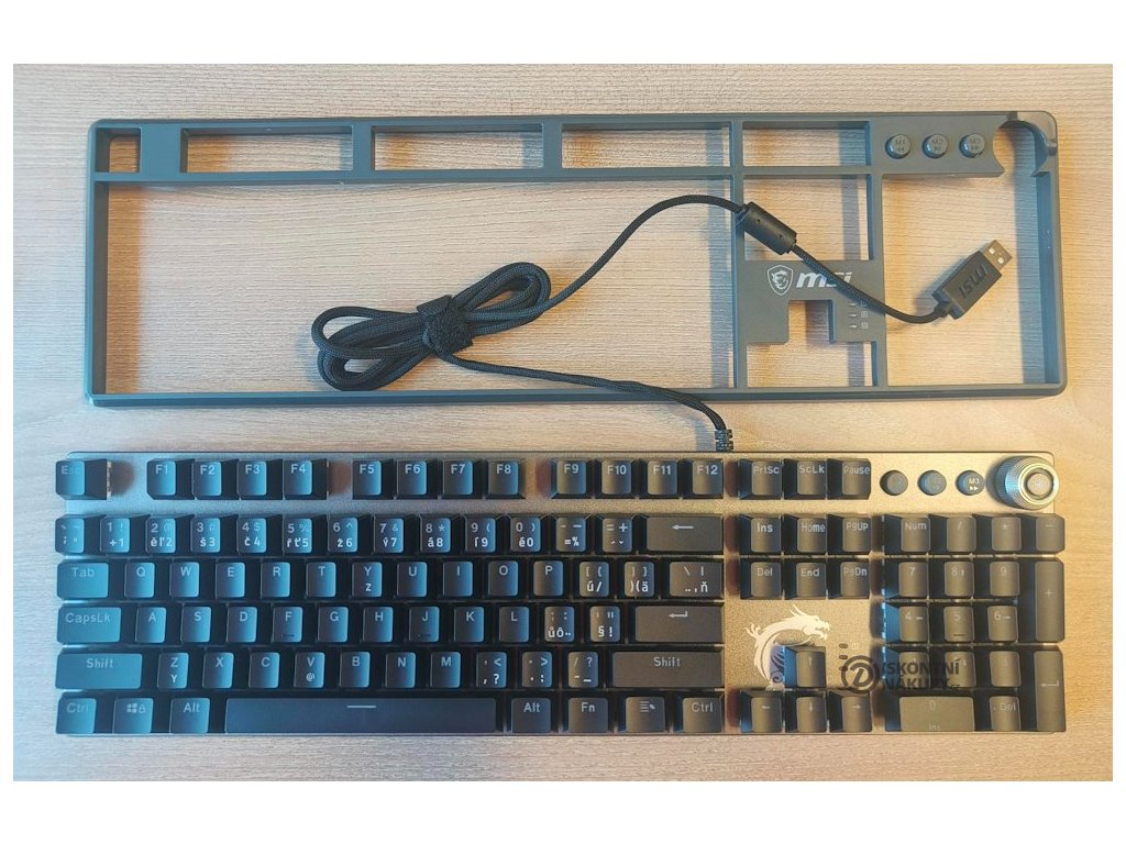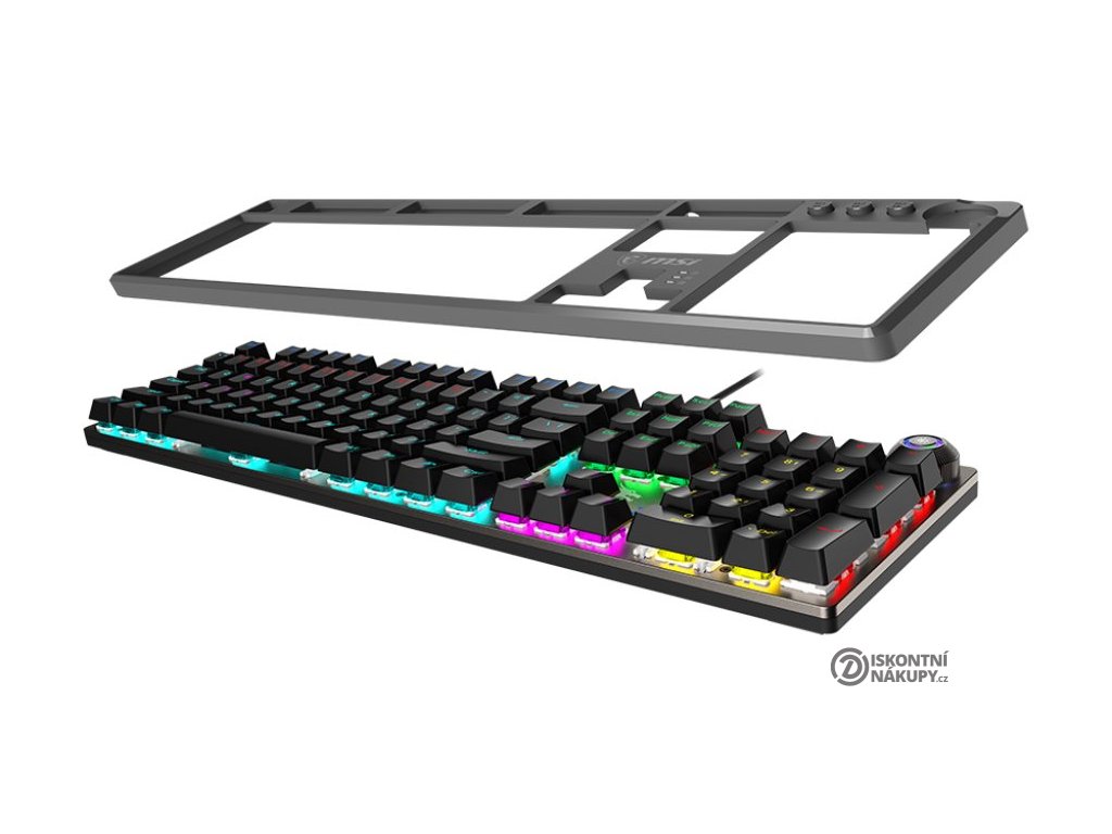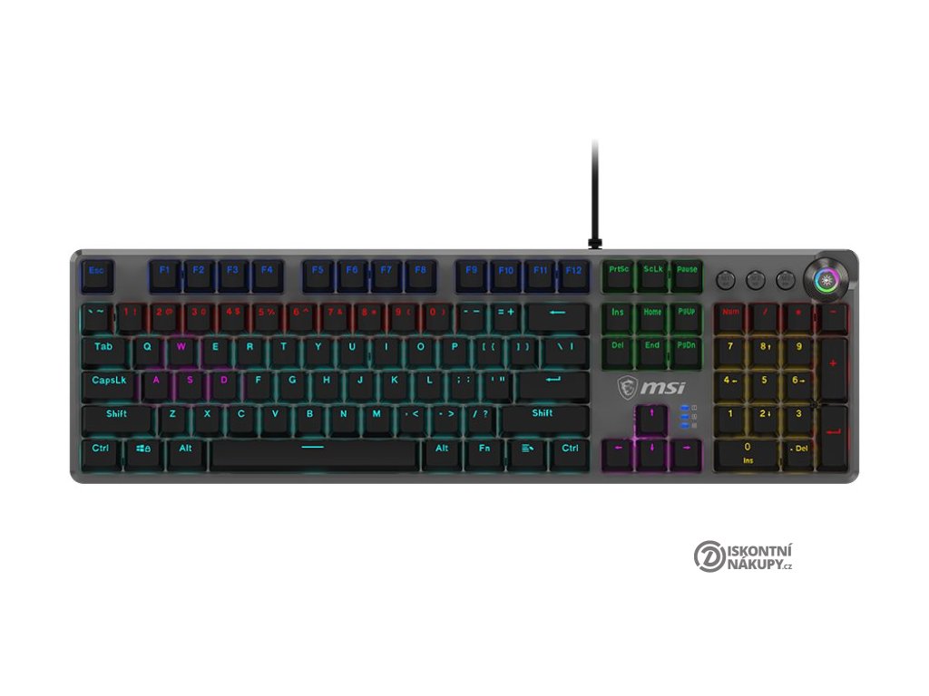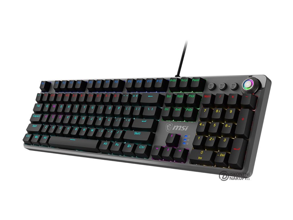 Mechanická herní klávesnice disponující spínači MSI Red, které zajišťují rychlost, přesnost a životnost více než 60 milionů stisků. Navíc umožňuje bez námahy vyměnit výchozí mechanické spínače za spínače třetích stran (3pinové) bez nutnosti pájení. Nabízí možnost RGB podsvícení kláves s předdefinovanými efekty. Vhod jistě přijde také funkce Anti-ghosting s N-Key rollover. Klávesnice disponuje tlačítky, které vám umožní rychle upravovat světelné efekty, spravovat ovládací prvky médií a přistupovat k widgetům. Odnímatelný magnetický horní kryt doplňuje matný kovový povrch klávesnice. Snadno jej připevníte nebo odejmete a spojíte tak estetický vzhled s praktickými výhodami, jako je snadnější údržba. Špičkové pohodlí zajistí ergonomická konstrukce kláves s vysokým sklonem, která udržuje přirozenou polohu ruky a zápěstí. Připojení je realizováno skrze opletený USB kabel o délce 1,8 m.