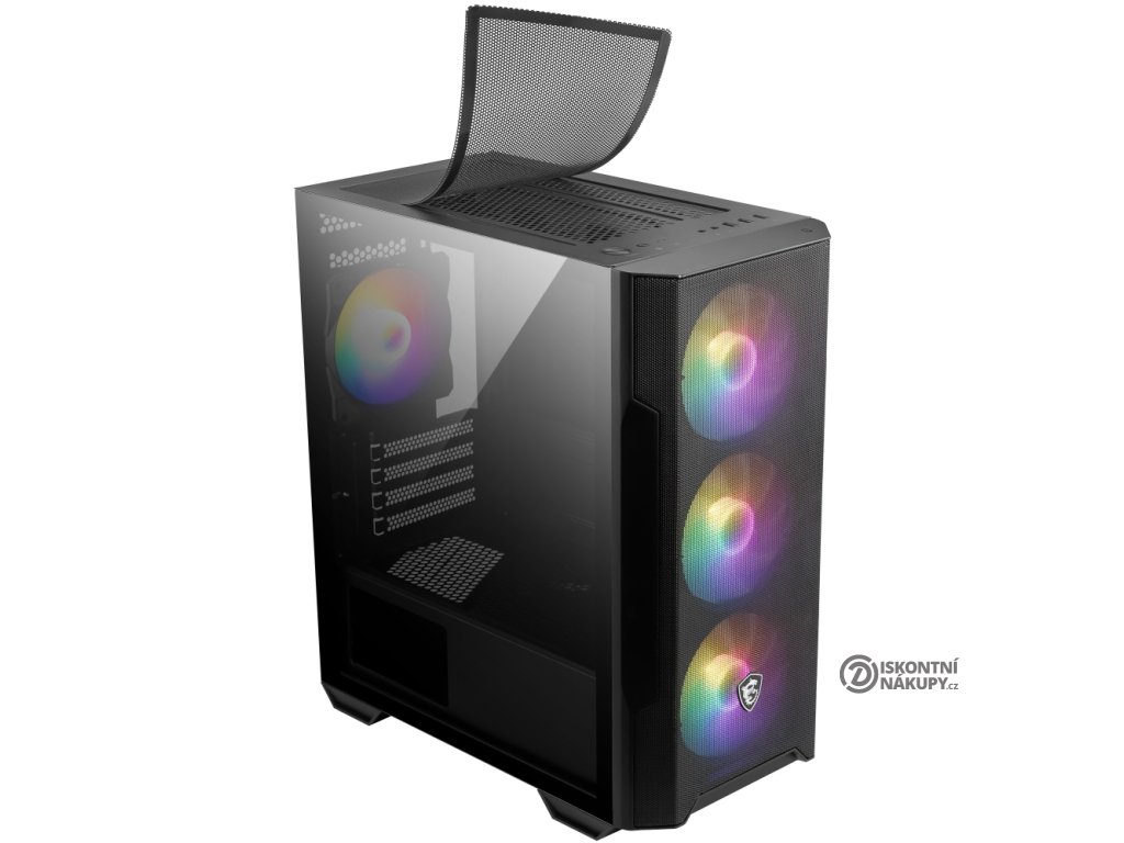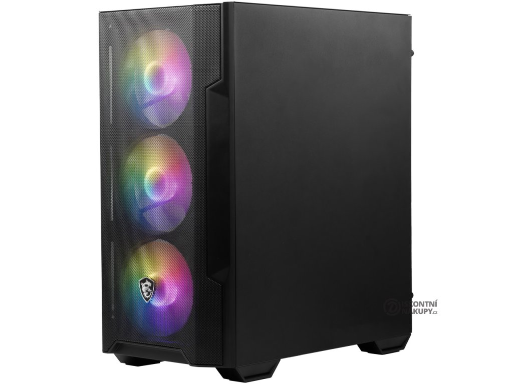 MSI MAG FORGE M100RKvalitní počítačová skříň formátu Micro Tower nabízí dvě 2,5", jednu 2,5"/3,5" a jednu 3,5" pozici pro SSD a pevné disky. Na horním panelu se nachází dva porty USB 2.0, jeden USB 3.0, sluchátkový výstup a audio vstup pro mikrofon. Vybavena je čtyřmi 120 mm ventilátory s ARGB podsvícením, které spolu s perforovaným čelním panelem zajišťují dostatečné proudění vzduchu. Ve skříni je dostatek prostoru pro chladič CPU do výšky až 160 mm a grafickou kartu o délce až 300 mm. Skříň disponuje průhlednou bočnicí a je dodávána bez zdroje. Důmyslné řešení umožňuje pohodlné umístění až 240 mm dlouhého výměníku vodního chlazení na přední i horní straně. Součástí skříně je také magnetický prachový filtr.