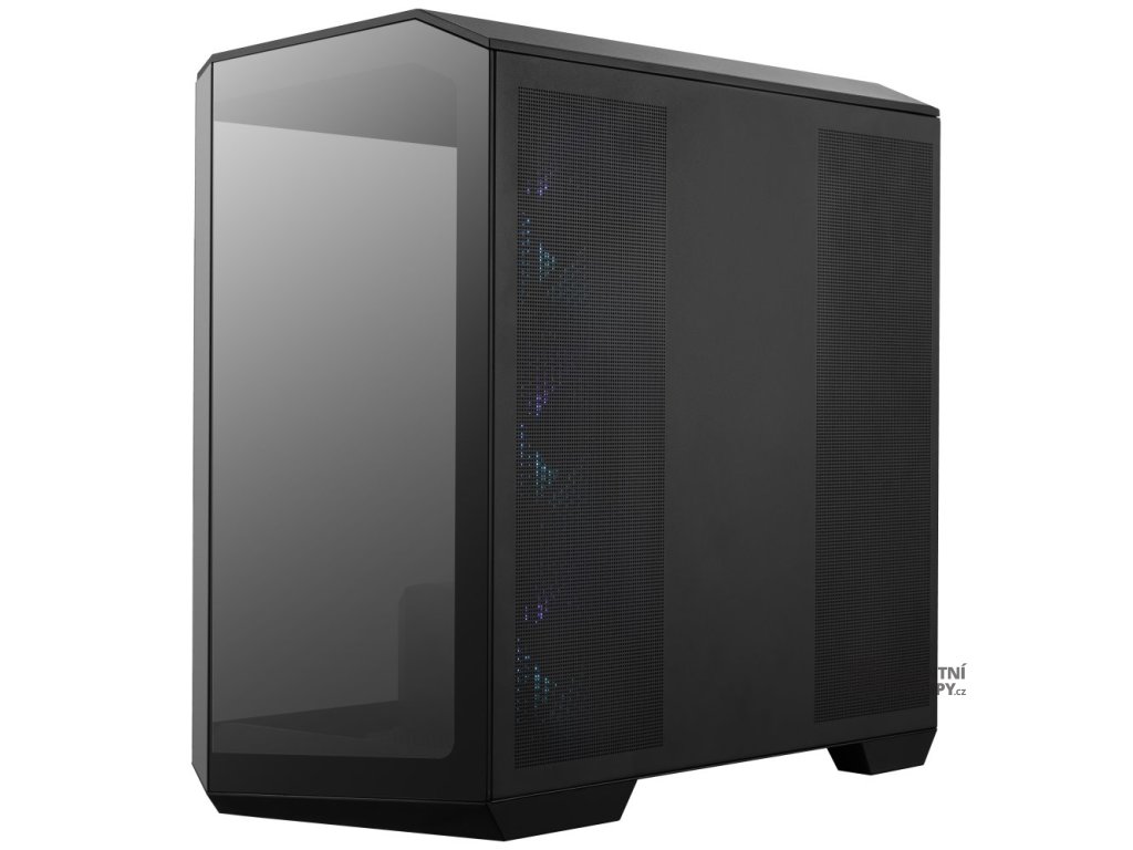 MSI MAG PANO M100R PZKvalitní počítačová skříň formátu Mini Tower nabízí jednu 2,5" pozici pro SSD disk a jednu 2,5"/3,5" pozici pro SSD nebo pevný disk. Skříň je vybavena průhlednou bočnicí a předním panelem, která spolu s ARGB podsvícením ventilátorů zajišťuje vytříbený design. Rychlou změnu podsvícení umožňuje přítomný ARGB rozbočovač pro 4 ventilátory a tlačítko ve spodní části bočnice. Zde se také nachází jeden port USB 3.0, jeden port USB-C, kombinovaný port sluchátek a mikrofonu i tlačítko napájení. Předinstalovány jsou tři 120mm ARGB ventilátory na boční straně a jeden 120mm ARGB ventilátor na zadní straně. Ve skříni je dostatek prostoru pro chladič CPU do výšky až 175 mm a grafickou kartu o délce až 390 mm. Důmyslné řešení umožňuje pohodlné umístění až 360 mm dlouhého výměníku vodního chlazení na horní straně. Potěší také přítomnost magnetického prachového filtru. Skříň je dodávána bez zdroje.