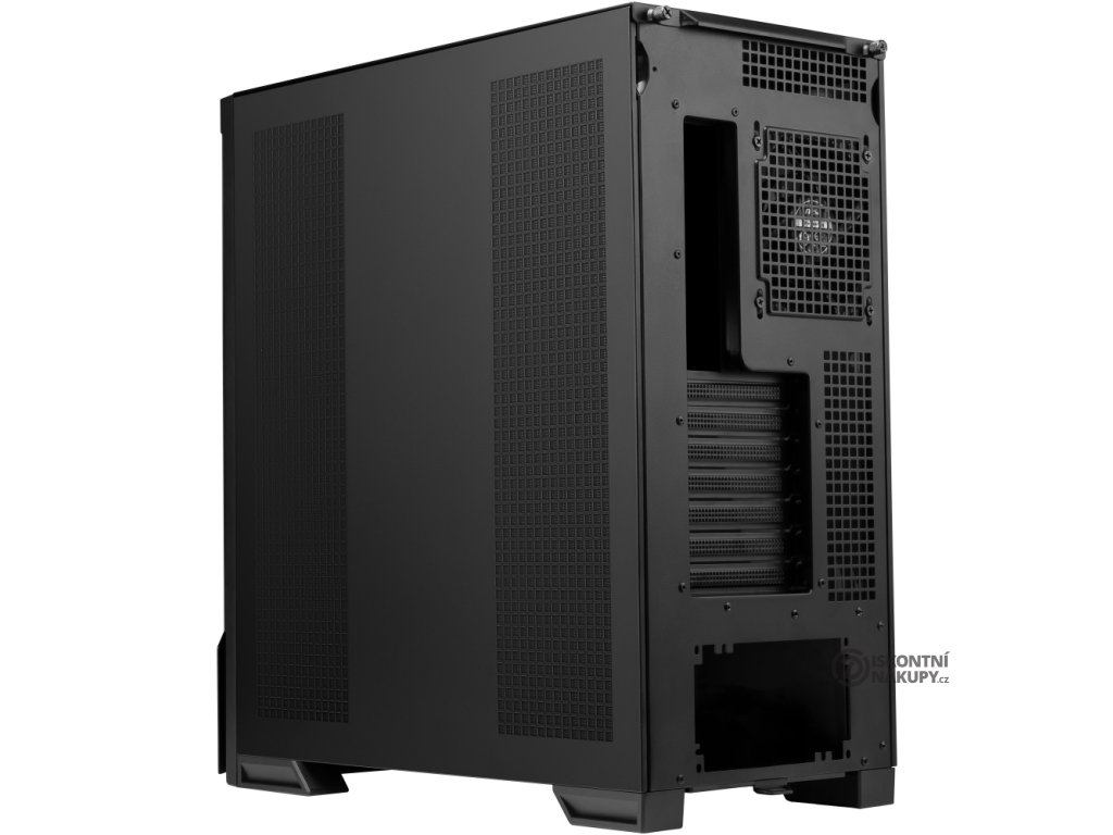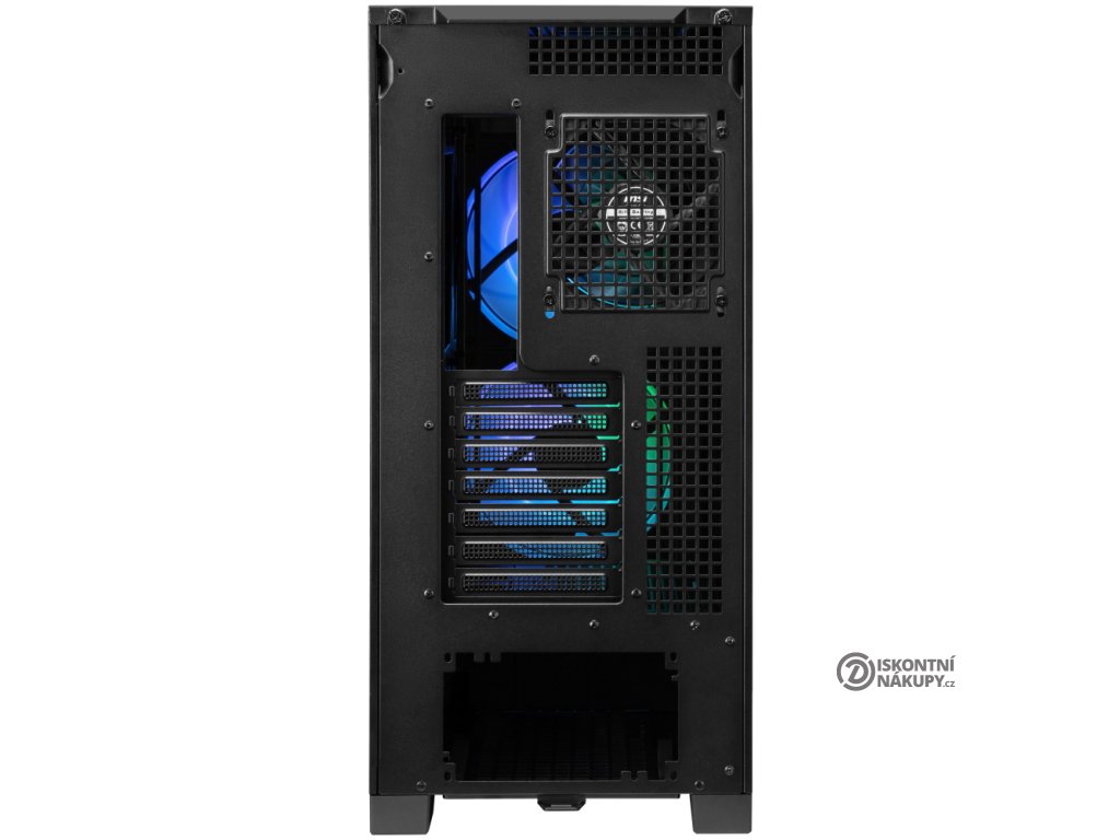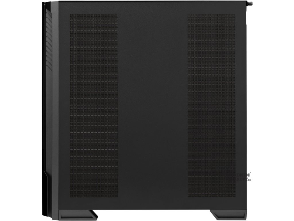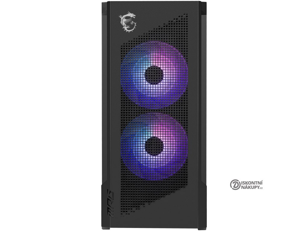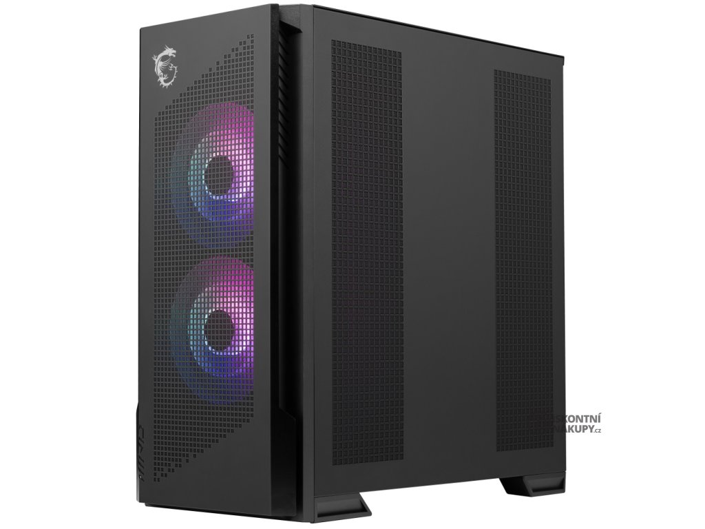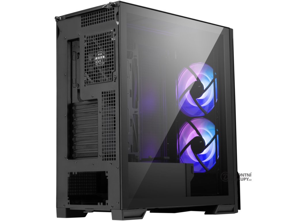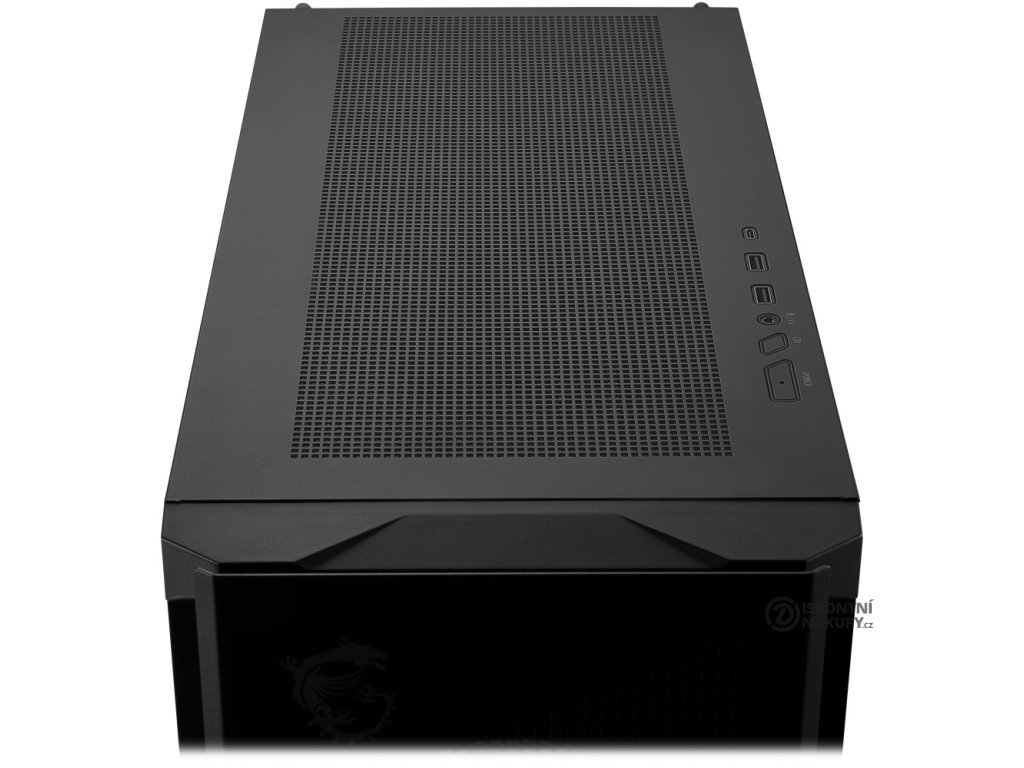 MSI MPG VELOX 300R AIRFLOW PZKvalitní počítačová skříň formátu Middle Tower nabízí 4× 2,5", 1× 3,5" a 1× 2,5"/3,5" volné pozice pro uložení pevných nebo SSD disků. Skříň je vybavena průhlednou bočnicí a předním panelem. Předinstalovány jsou dva 160mm ventilátory s adresovatelným RGB podsvícením a jeden 120mm ventilátor bez podsvícení. Rychlou změnu podsvícení umožňuje tlačítko na horním panelu. Zde se také nachází dva porty USB 3.0, jeden port USB-C a kombinovaný port sluchátek a mikrofonu. Ve skříni je dostatek prostoru pro chladič CPU do výšky až 165 mm a grafickou kartu o délce až 400 mm. Důmyslné řešení umožňuje pohodlné umístění až 360 mm dlouhého výměníku vodního chlazení na přední, horní i boční straně. Potěší také přítomnost odnímatelných prachových filtrů. Skříň je dodávána bez zdroje.