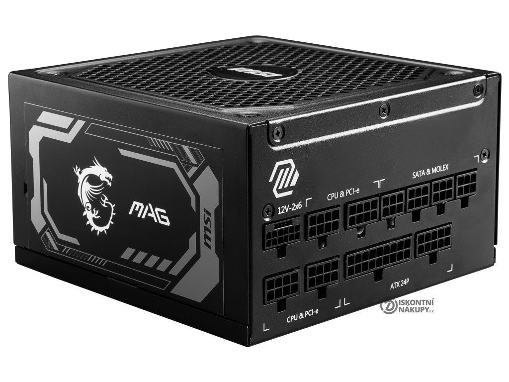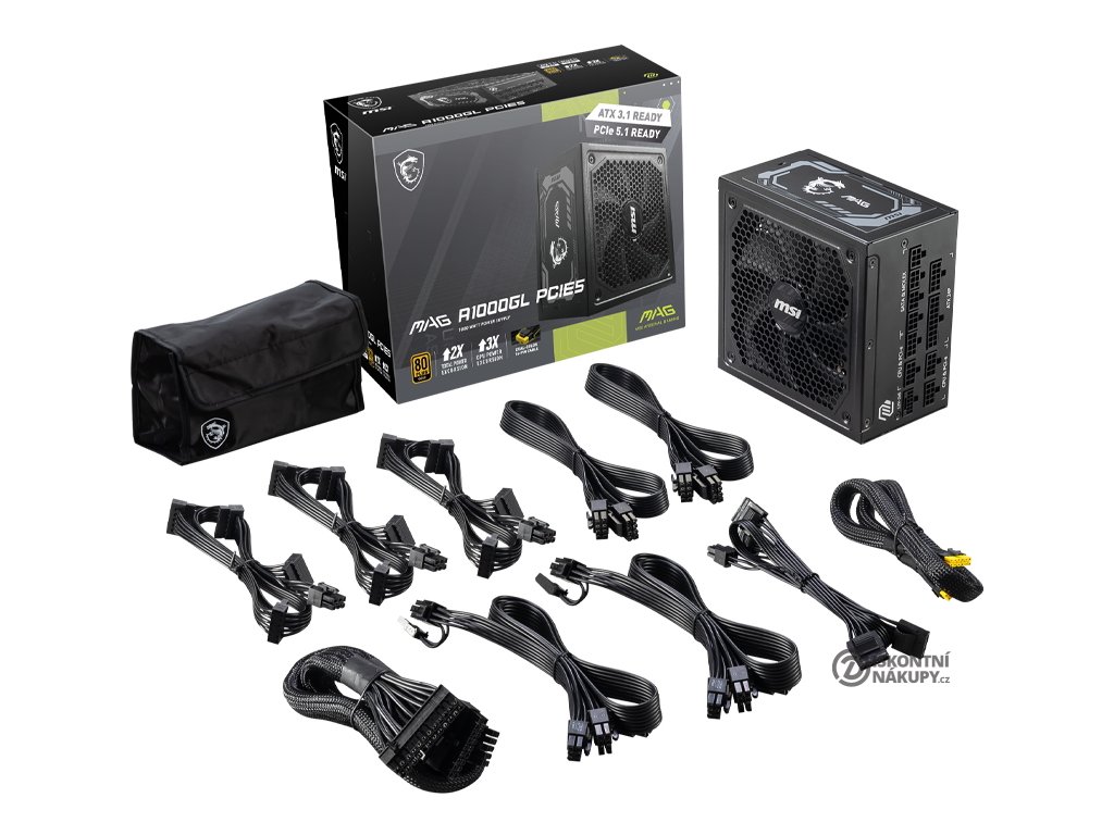 MSI MAG A1000GL PCIE5 1000 WNapájecí zdroj o výkonu 1000 W je osazen 135mm ventilátorem. Zdroj splňuje certifikaci 80PLUS Gold.