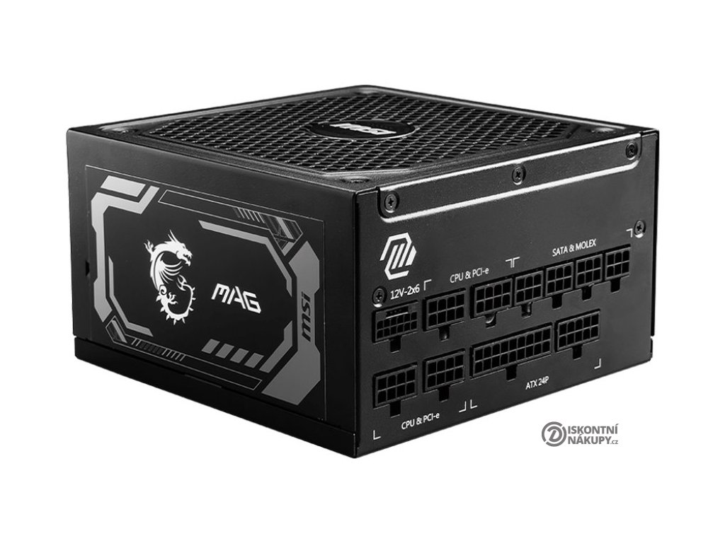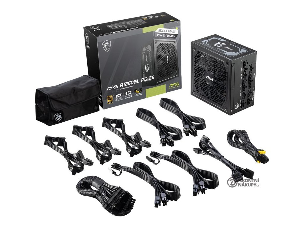 MSI MAG A1250GL PCIE5 1250 WNapájecí zdroj o výkonu 1250 W je osazen 135mm ventilátorem. Zdroj splňuje certifikaci 80PLUS Gold.