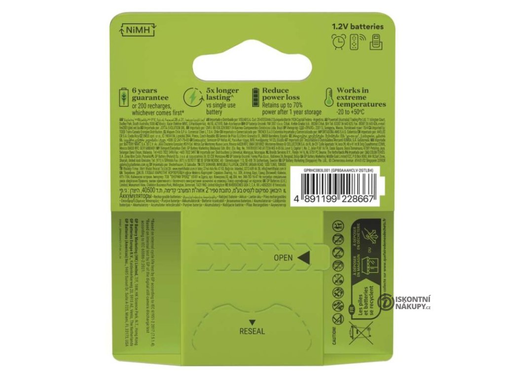 chemické složení: NiMH|hmotnost: 12 g|kapacita: 800 mAh|kategorie/řada: Rechargeable|max. skladovatelnost: neuvádí se|možnost nabíjení: ano|napětí: 1,2 V|počet nabíjecích cyklů: více než 200|prodejní obal: 4 ks, papírová krabička|provozní teplota: -20 °C až +50 °C|rozměr: 10,5 × 44,5 mm|typ: HR03 (mikrotužka, AAA)|velikost baterie: AAA|značka: GPDoplňkové parametry