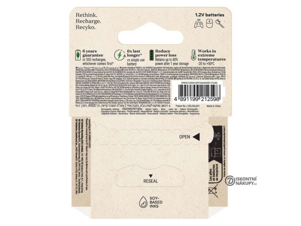 chemické složení: NiMH|hmotnost: 27 g|kapacita: 2 100 mAh|kategorie/řada: ReCyko|max. skladovatelnost: neuvádí se|možnost nabíjení: ano|napětí: 1,2 V|počet nabíjecích cyklů: více než 500|prodejní obal: 4 ks, papírová krabička|provozní teplota: -20 °C až +50 °C|rozměr: 14,5 × 50,5 mm|typ: HR6 (tužka, AA)|velikost baterie: AA|značka: GPDoplňkové parametry