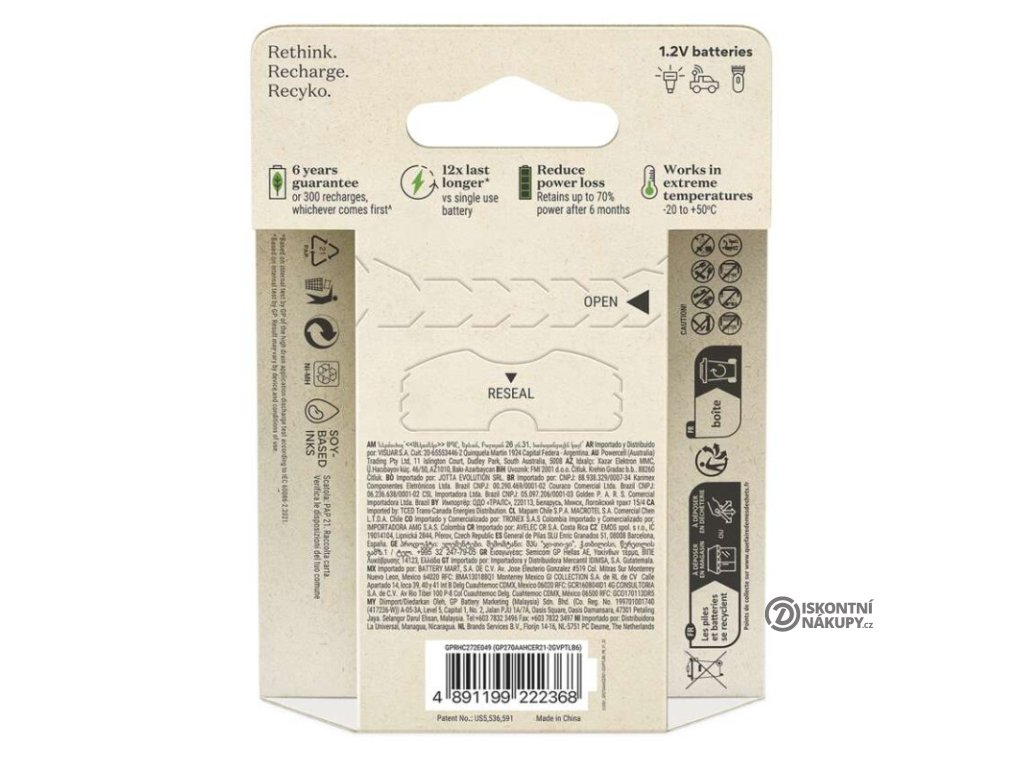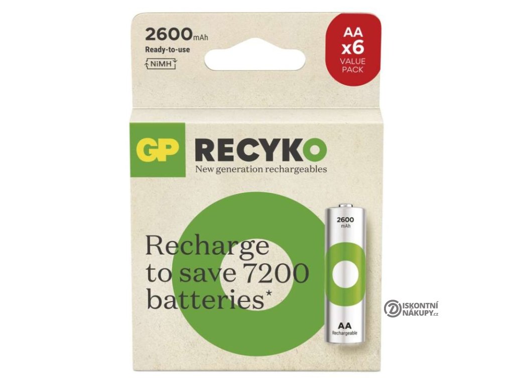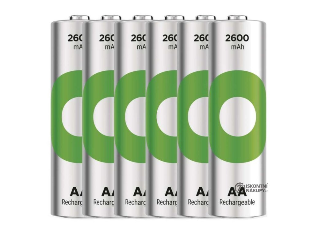 chemické složení: NiMH|hmotnost: 31 g|kapacita: 2 600 mAh|kategorie/řada: ReCyko|max. skladovatelnost: neuvádí se|možnost nabíjení: ano|napětí: 1,2 V|počet nabíjecích cyklů: až 300|prodejní obal: 6 ks, papírová krabička|provozní teplota: -20 °C až +50 °C|rozměr: 14,5 × 50,5 mm|typ: HR6 (tužka, AA)|velikost baterie: AA|značka: GPDoplňkové parametry