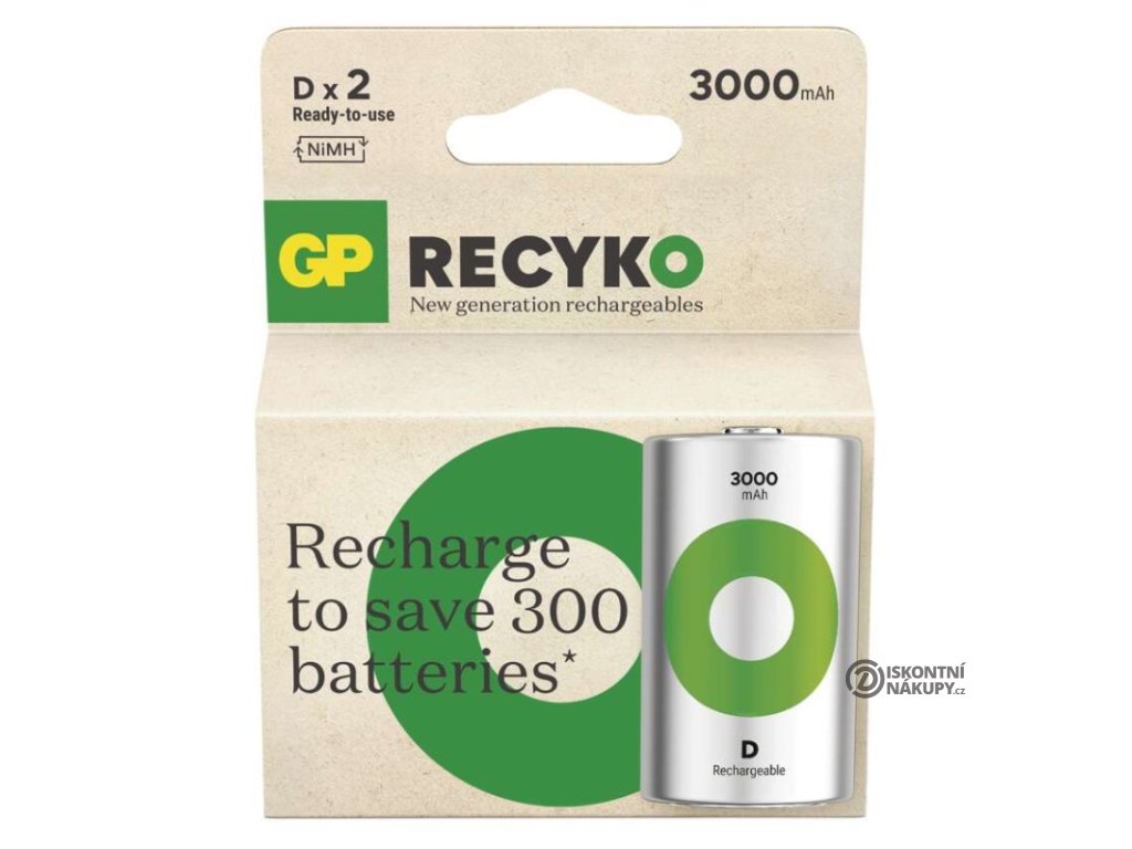 chemické složení: NiMH|hmotnost: 70 g|kapacita: 3 000 mAh|kategorie/řada: ReCyko|max. skladovatelnost: neuvádí se|možnost nabíjení: ano|napětí: 1,2 V|počet nabíjecích cyklů: více než 1 000|prodejní obal: 2 ks, papírová krabička|provozní teplota: -20 °C až +50 °C|rozměr: 34,2 × 61,5 mm|typ: HR20 (velké mono, D)|velikost baterie: D|značka: GPDoplňkové parametry