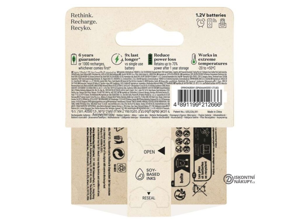 chemické složení: NiMH|hmotnost: 12 g|kapacita: 650 mAh|kategorie/řada: ReCyko|max. skladovatelnost: neuvádí se|možnost nabíjení: ano|napětí: 1,2 V|počet nabíjecích cyklů: více než 1 000|prodejní obal: 2 ks, papírová krabička|provozní teplota: -20 °C až +50 °C|rozměr: 10,5 × 44,5 mm|typ: HR03 (mikrotužka, AAA)|velikost baterie: AAA|značka: GPDoplňkové parametry