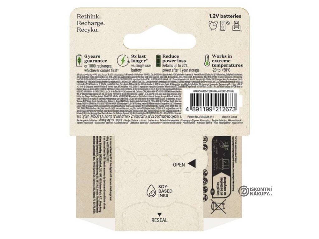 chemické složení: NiMH|hmotnost: 12 g|kapacita: 650 mAh|kategorie/řada: ReCyko|max. skladovatelnost: neuvádí se|možnost nabíjení: ano|napětí: 1,2 V|počet nabíjecích cyklů: více než 1 000|prodejní obal: 4 ks, papírová krabička|provozní teplota: -20 °C až +50 °C|rozměr: 10,5 × 44,5 mm|typ: HR03 (mikrotužka, AAA)|velikost baterie: AAA|značka: GPDoplňkové parametry