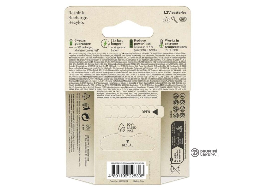 chemické složení: NiMH|hmotnost: 15 g|kapacita: 950 mAh|kategorie/řada: ReCyko|max. skladovatelnost: neuvádí se|možnost nabíjení: ano|napětí: 1,2 V|počet nabíjecích cyklů: více než 500|prodejní obal: 6 ks, papírová krabička|provozní teplota: -20 °C až +50 °C|rozměr: 10,5 × 44,5 mm|typ: HR03 (mikrotužka, AAA)|velikost baterie: AAA|značka: GPDoplňkové parametry