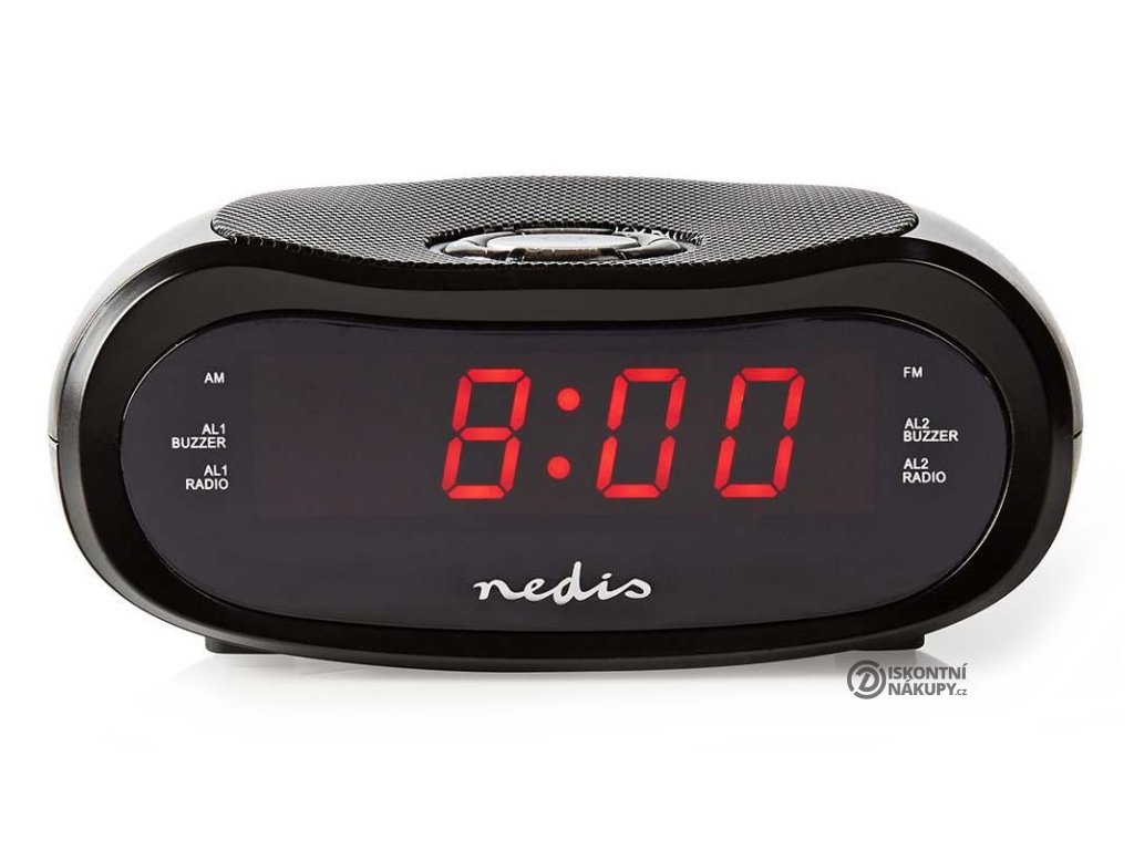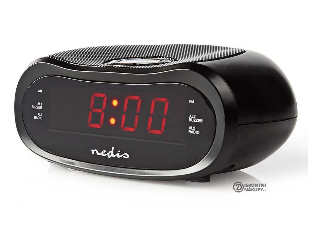 NEDIS digitální budík s rádiem/ LED displej/ AM/ FM/ funkce odloženého buzení/ časovač vypnutí/ 2 alarmy/ černý CLAR001BK