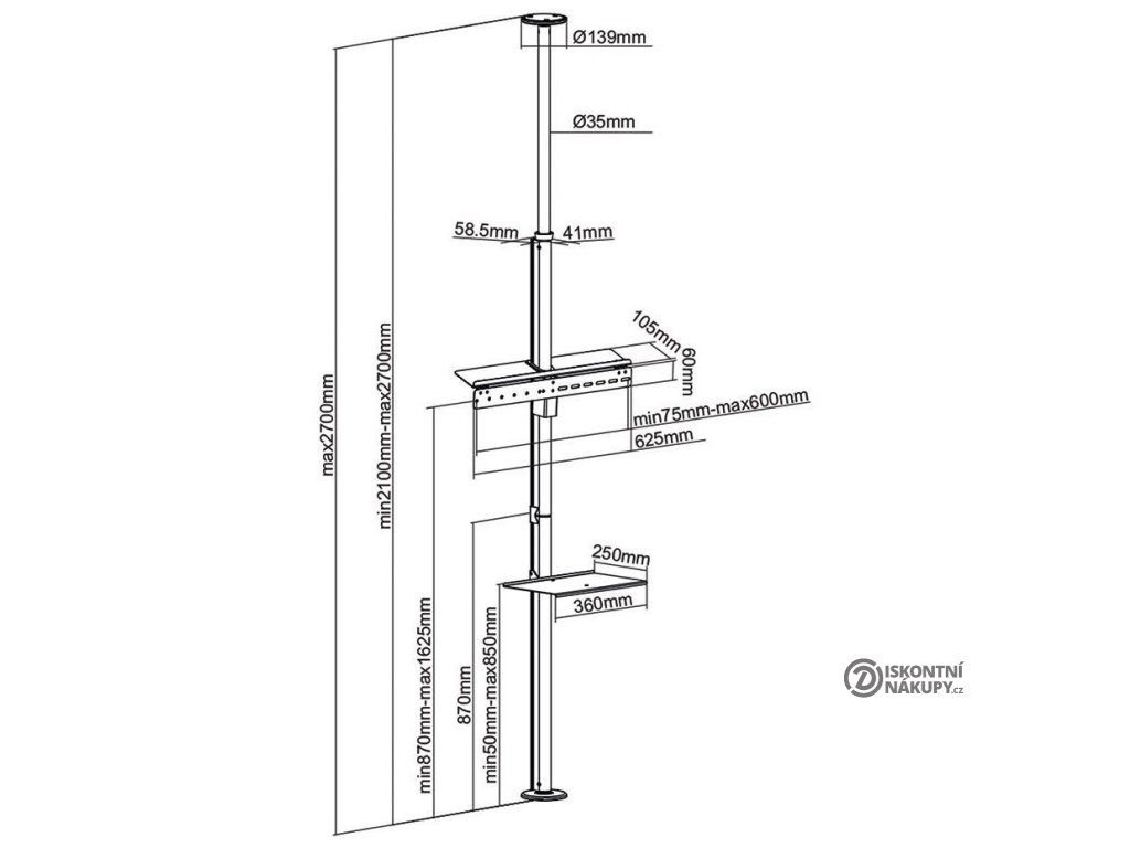 Nedis TVSM5750BKStojan pro montáž televize s úhlopříčkou 37 až 70" určený k upevnění mezi podlahu a strop. Díky teleskopické tyči je možné jej umístit do místrnosti o výšce 210 až 270 cm. Konstrukce stojanu umožňuje snadné nastavení výšky od 87 do 162,5 centrimetrů a otáčení v rozsahu 180°. Zajisté potěší také police pro AV komponenty nebo vestavěný systém správy kabeláže. Maximální hmotnost televizoru je 30 kg, nosnost police pro příslušenství činí 5 kg.