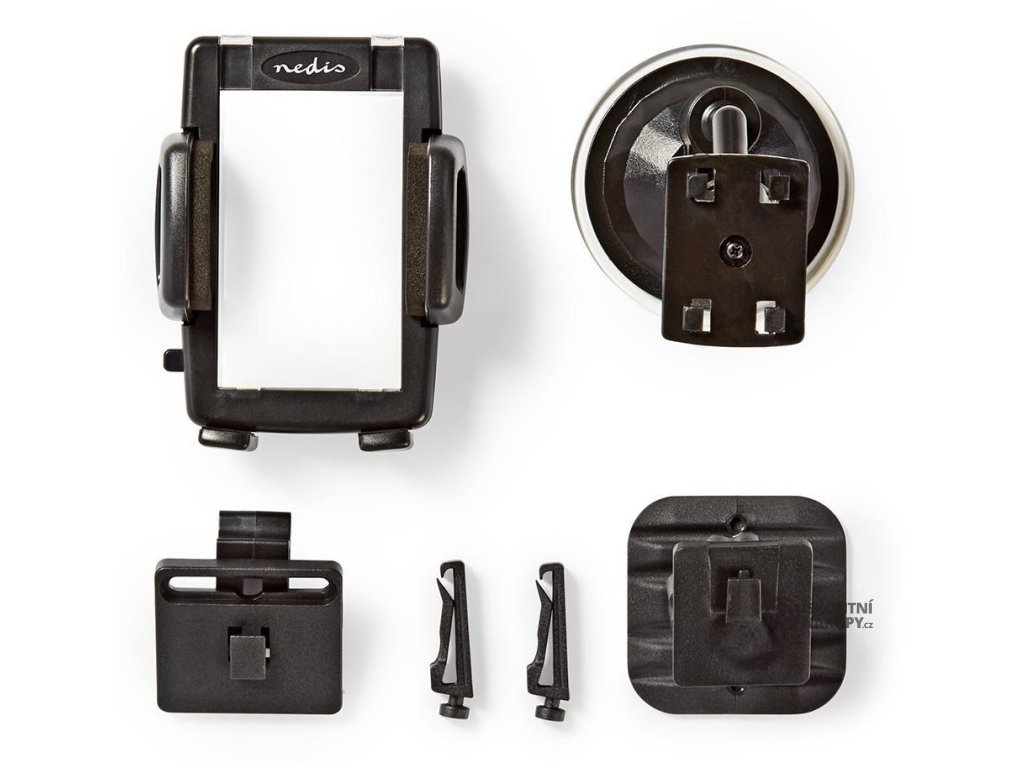 Nedis SCMT600BKDržák do auta s nastavitelným úhlem pro mobilní telefon s displejem o velikosti 4" až 6,4". Držák lze přichytit na okno pomocí přísavky, na otvor ventilace či na palubní desku.
