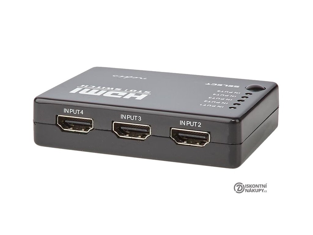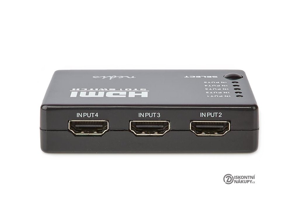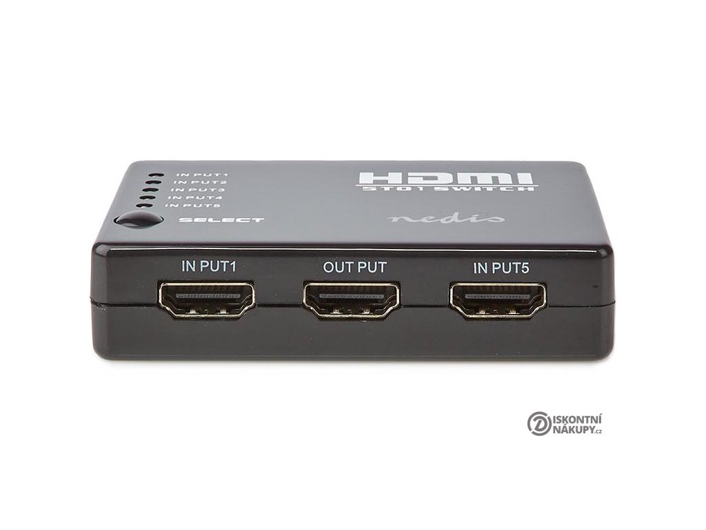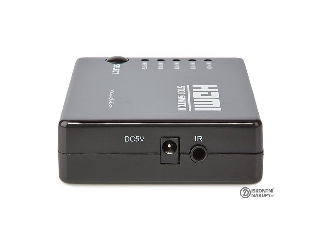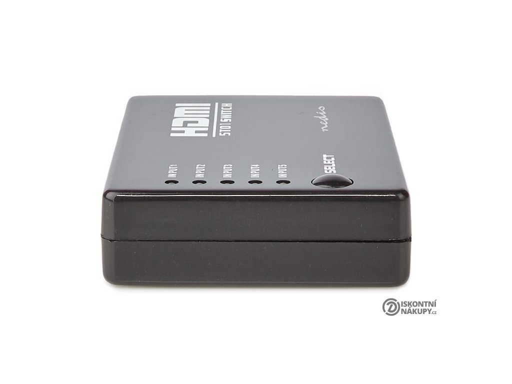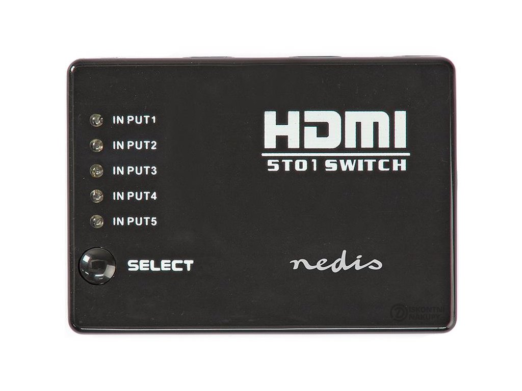 Nedis VSWI3455BKHDMI switch/přepínač 5:1 umožňuje, aby pět HDMI zařízení sdílelo jediné HDMI výstupní zařízení (obrazovku). Výběr zařízení probíhá stiskem tlačítka nebo pomocí dálkového ovládání. Zařízení podporuje datový tok 3,4 Gbps, Full HD rozlišení a 3D obraz. Pro zesílení HDMI signálu je možné připojit napájecí adaptér.