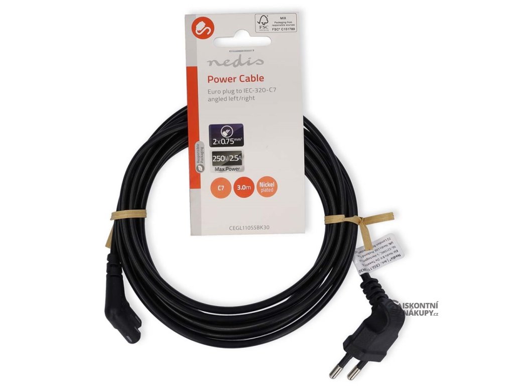 NEDIS napájecí kabel pro adaptéry/ Euro zástrčka - konektor IEC-320-C7/ úhlový-úhlový/ dvoulinka/ černý/ bulk/ 3m CEGL11055BK30