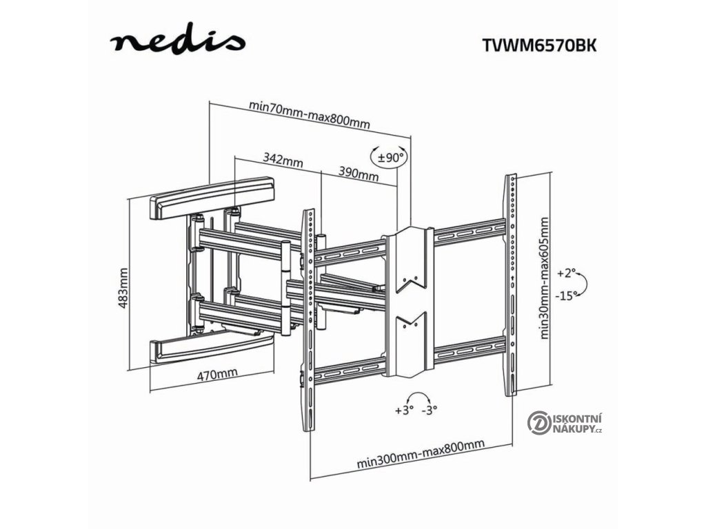 Nedis TVWM6570BKSklopný a otočný nástěnný držák pro ploché obrazovky s úhlopříčkou od 43" do 100" a hmotností až 70 kg. Možnost náklonu o +2° až -15° a otáčení až 180° umožňuje nastavit požadovaný úhel pohledu pro maximální flexibilitu při sledování obrazovky. Vestavěný systém správy kabeláže minimalizuje nepořádek. Držák má snadno nastavitelnou vzdálenost od zdi v rozsahu 7 až 80 cm a je vhodný pro obrazovky, které odpovídají standardům VESA 300 × 200 až 800 × 600 mm.