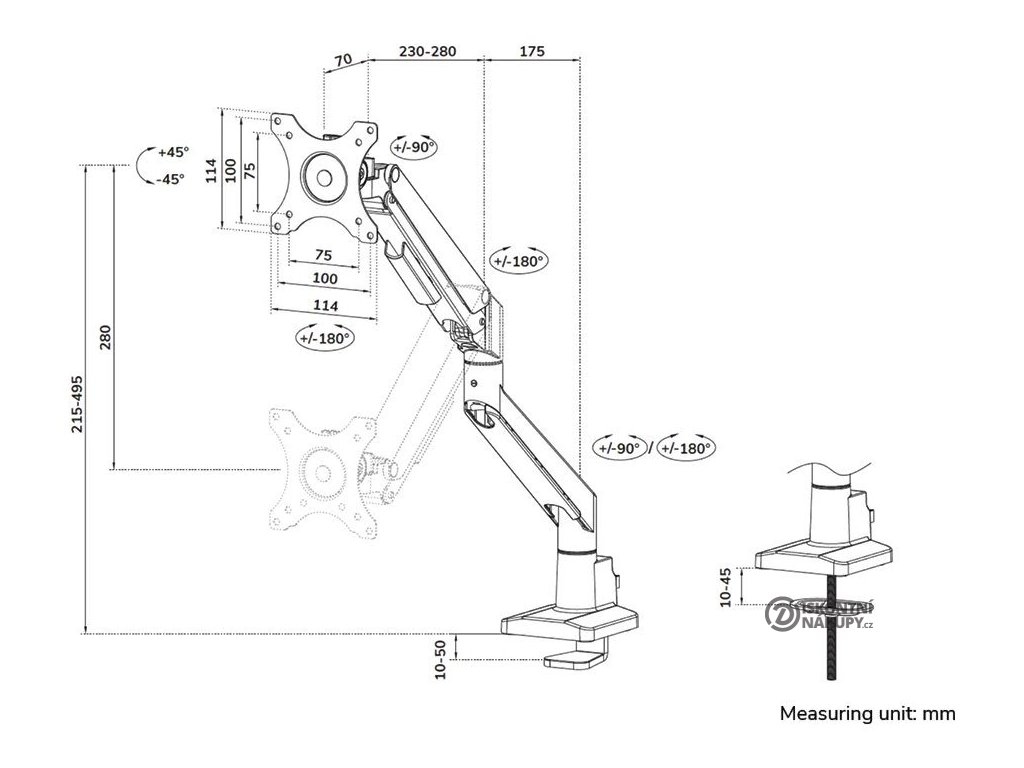 | Konstrukce: | kloubový, otočný, s náklonem, s nastavitelnou výškou, s plynovou pružinou, sklopný |