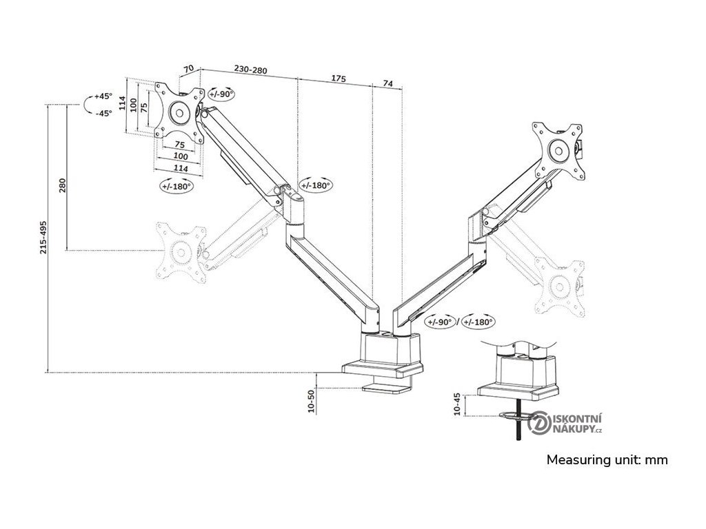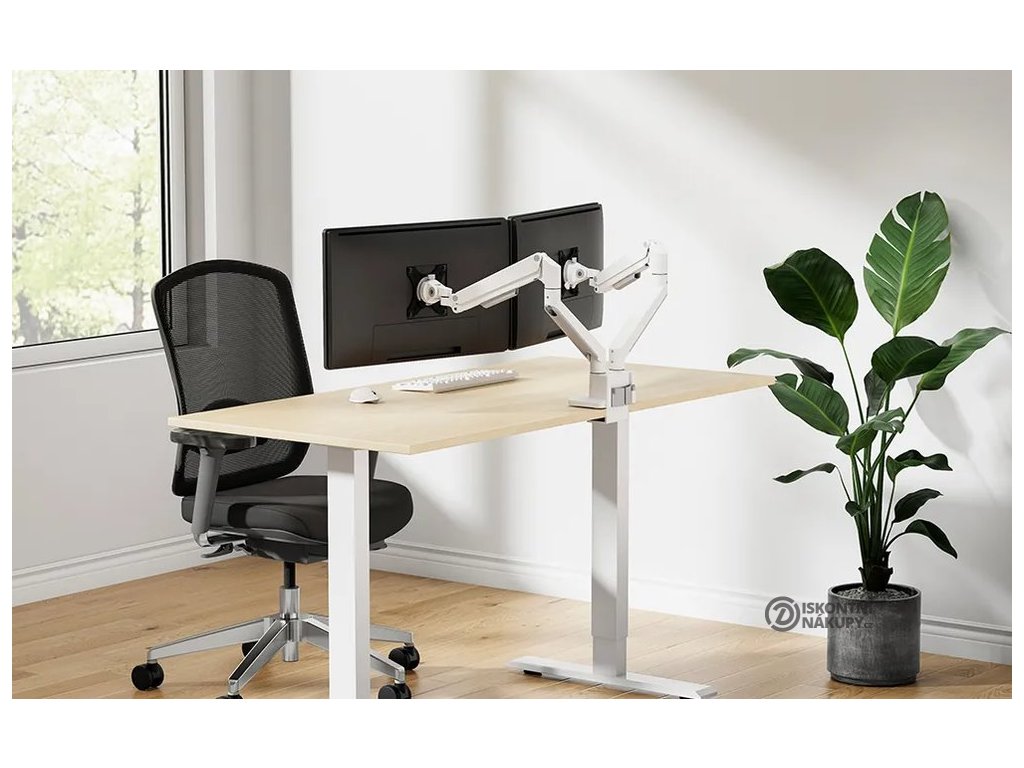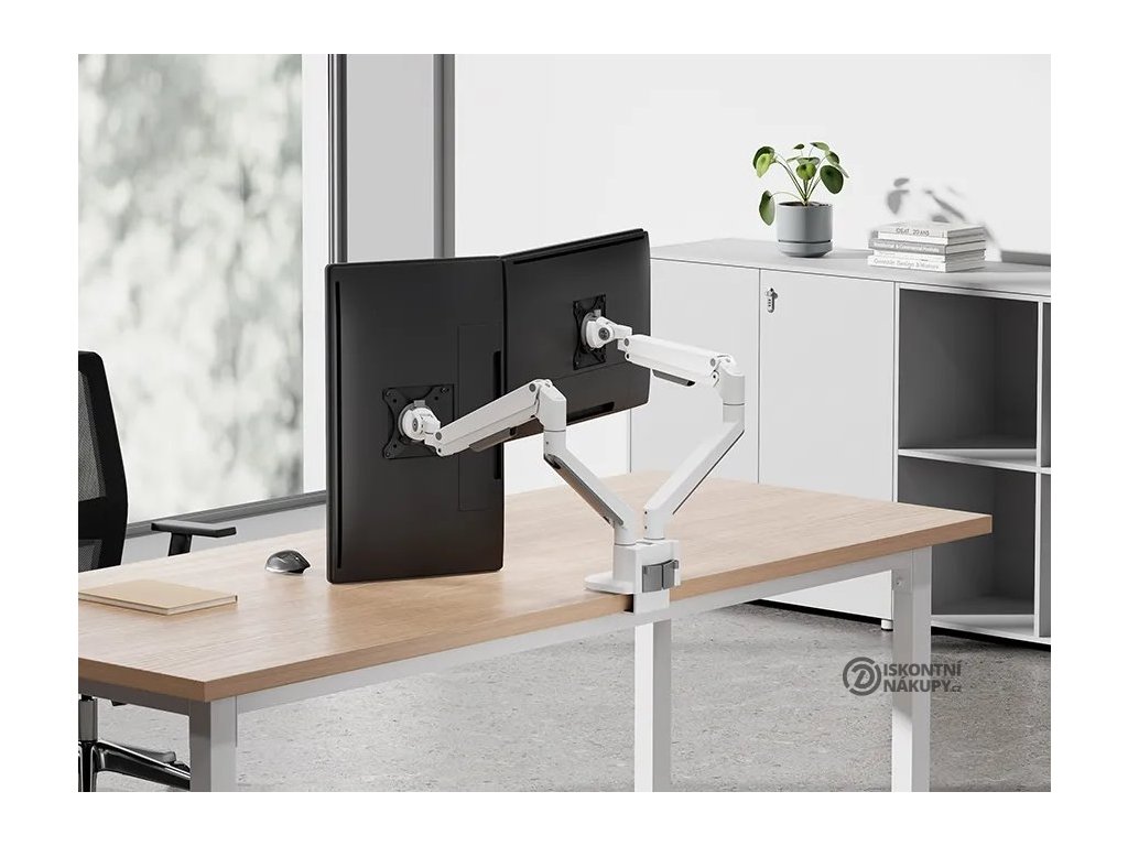 Neomounts DS70-250WH2Plně pohyblivý stolní držák pro dva ploché nebo zakřivené monitory s úhlopříčkou 17" až 32" a maximální hmotností 18 kg (2× 9 kg). Všestranná technologie naklápění, otáčení a rotace umožňuje vytvořit optimální pozorovací úhel. Držák má nastavitelnou výšku 21,5–49,5 cm, hloubku 7–45,5 cm a je vhodný pro obrazovky, které odpovídají vzoru otvorů VESA 75 × 75 až 100 × 100 mm. Potěší také systém pro úhledné vedení kabelů. Balení obsahuje stolní svorku i průchodku.