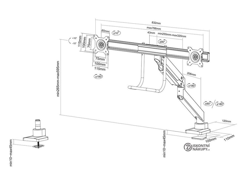 - Plně pohyblivý stolní držák pro 2 ploché obrazovky od 10"–32"