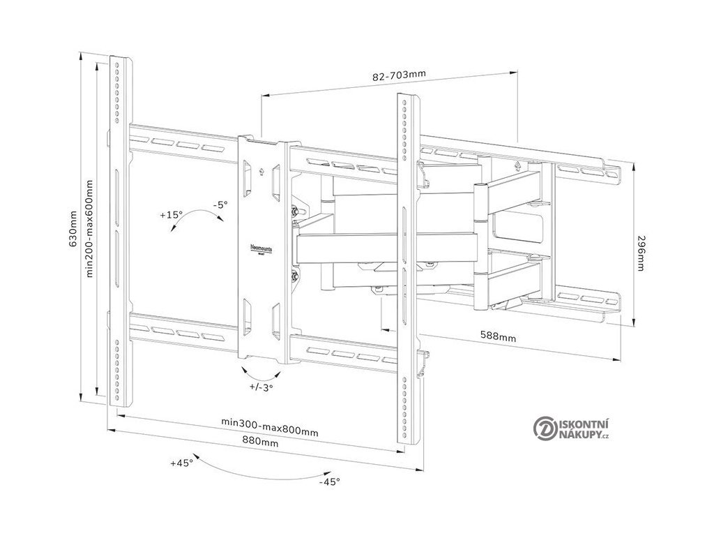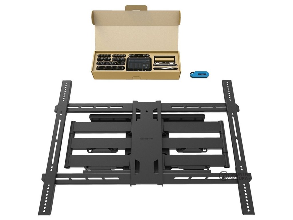Neomounts WL40S-950BL18Flexibilní nástěnný držák pro ploché obrazovky s úhlopříčkou od 55" do 110" a nosností až 125 kg. Díky technologii náklonu -15° až +5°, úhlu otáčení -45° až +45° a rotaci -3° až +3° umožňuje nastavit ideální úhel pohledu pro sledování obrazovky. Intuitivní systém správy kabeláže minimalizuje nepořádek. Hloubka držáku je snadno nastavitelná od 8,2 do 70 cm. Držák je kompatibilní se standardy VESA 300 × 100 až 800 × 600 mm. Přidanou hodnotou je praktický systém Easy-release pro připevnění televizoru mrknutím oka a samostatná vodováha + upevňovací šablona pro snadnou instalaci.