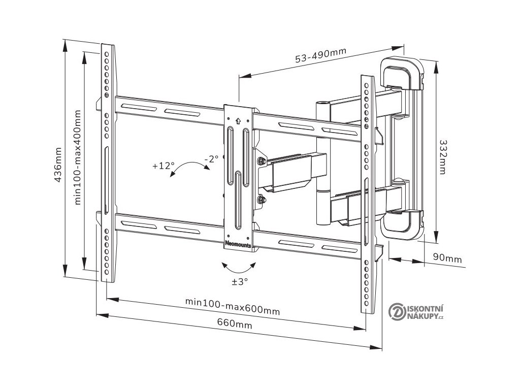 Neomounts WL40-550BL16Plně pohyblivý nástěnný držák pro ploché obrazovky od 40" do 65" s maximální nosností 40 kg. Všestranná technologie naklápění a otáčení umožňuje vytvořit optimální pozorovací úhel. Pro dosažení ideální instalace lze držák vyrovnat do vodorovné polohy. Držák má hloubku 5,3 až 49 cm a je vhodný pro obrazovky, které odpovídají vzoru otvorů VESA 100 × 100 až 600 × 400 mm.