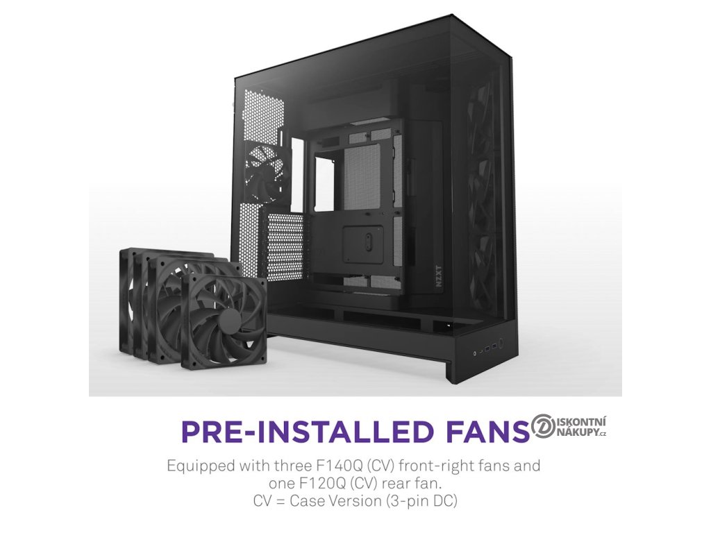 - Předinstalované ventilátory: Obsahuje tři ventilátory F140Q (CV) v přední pravé části a jeden ventilátor F120Q (CV) v zadní části.
