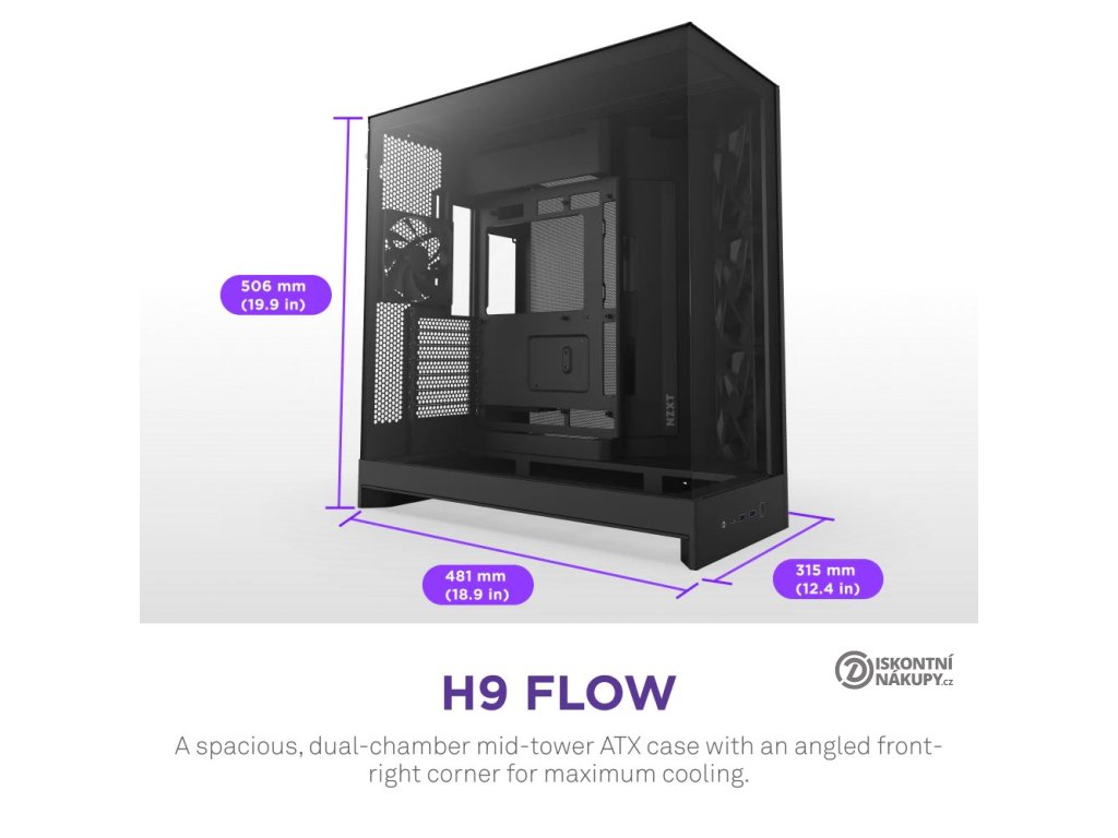 NZXT H9 Flow představuje stylovou počítačovou skříň ve formátu Middle Tower, která je navržena tak, aby poskytovala bohaté možnosti chlazení a vysoký výkon GPU. Rozsáhlé tepelné schopnosti umožňují instalovat celkem až 10 ventilátorů, přičemž 4 už jsou osazeny v základu. PC skříň NZXT H9 Flow se vyznačuje unikátním designem s nepřerušovaným skleněným panelem. Díky tomu vám poskytuje jasný vhled do interiéru.