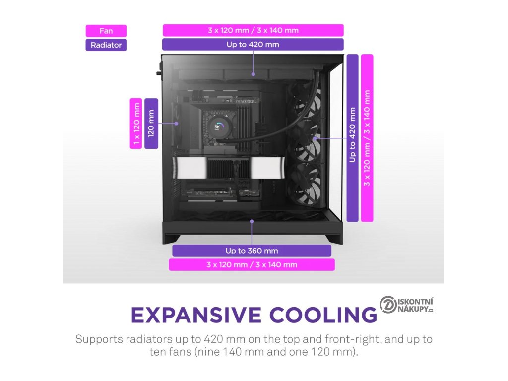 - Kapacita deseti ventilátorů: Podporuje až devět 140mm ventilátorů v horní, přední pravé a spodní části a jeden 120mm ventilátor v zadní části.