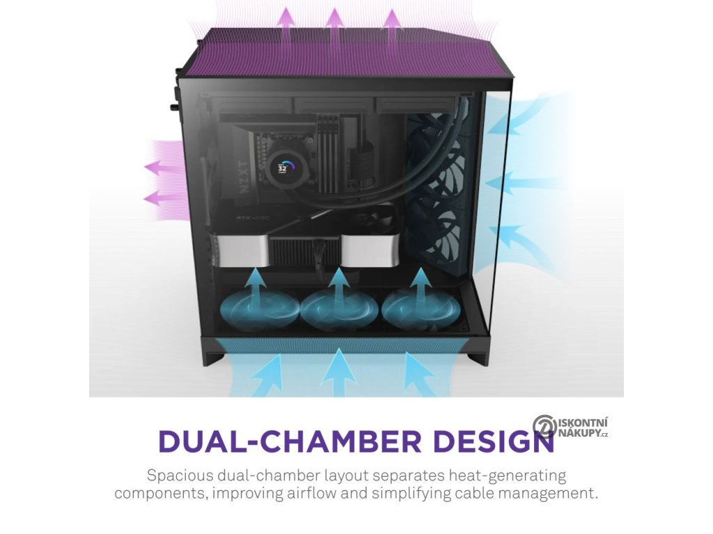 - Dvoukomorová konstrukce: Odděluje hlavní komponenty od zdroje napájení a disků pro lepší tepelný výkon a správu kabelů.