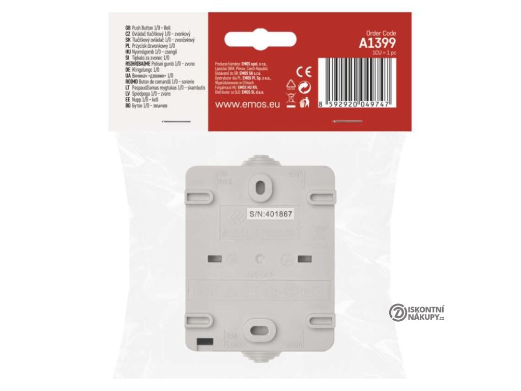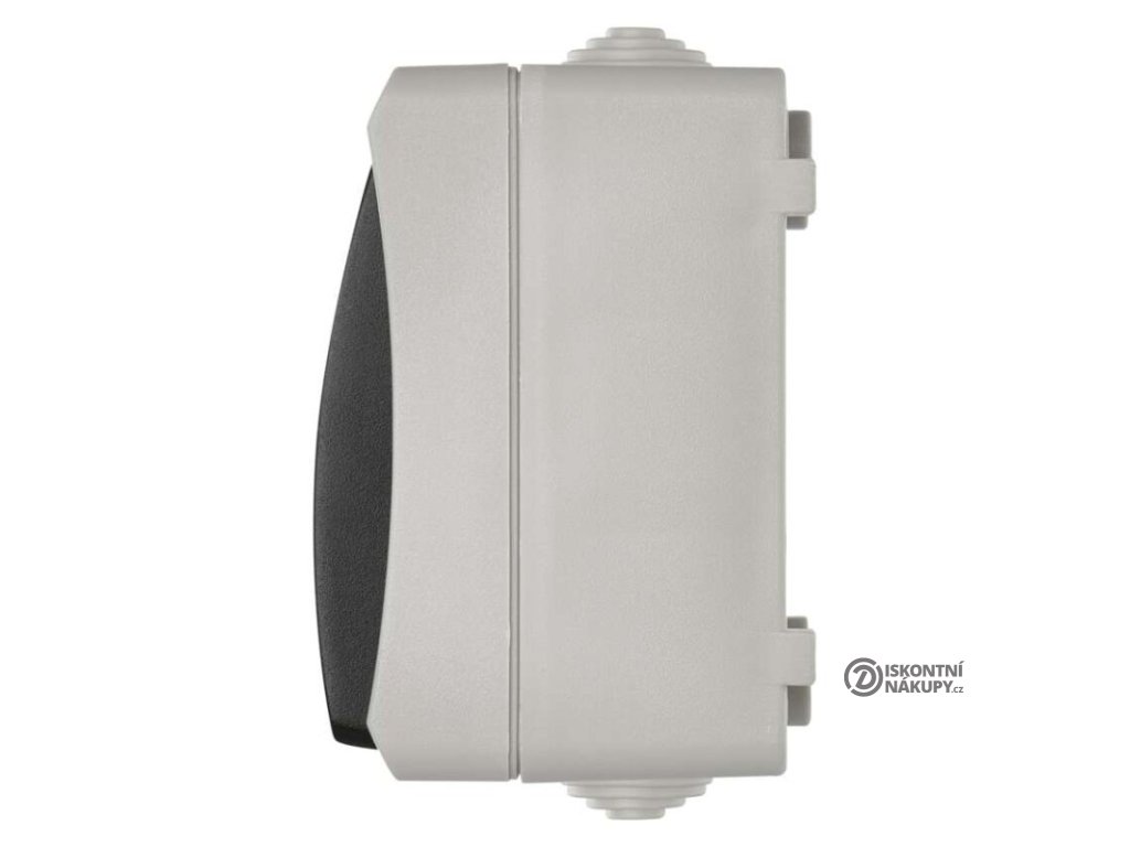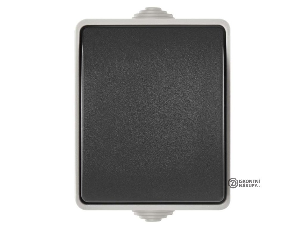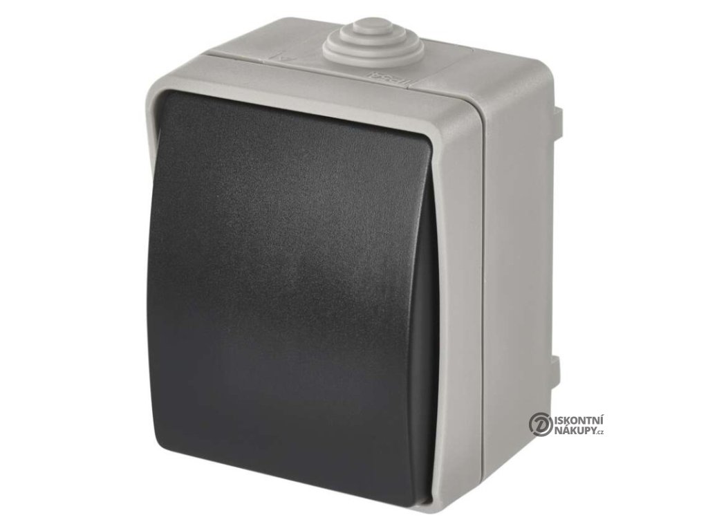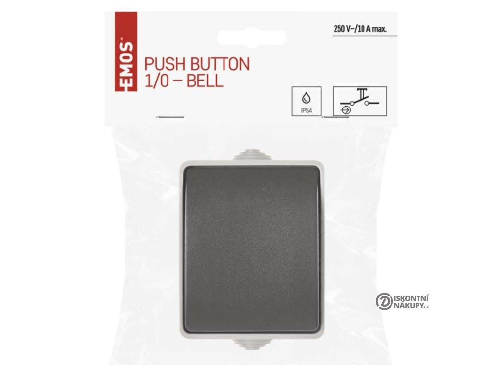 barva: šedo-černá|design: neuvádí se|krytí: IP54|napětí: 250 V~/10 A|prodejní obal: 1 ks, PE sáček|produkt: ovladač zapínací (1/0)|provedení: 1 tlačítko|způsob montáže: na stěnuPopis produktu