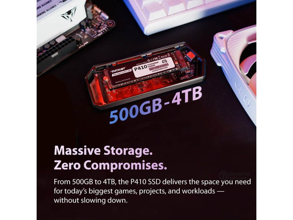 Design s vysoce účinným tenkým grafenovým chladičem je navržen s ohledem na efektivní chlazení a celkově optimální tepelný management. Technologie SmartECC se postará o ochranu a integritu dat. Mezi další přednosti patří nízká spotřeba energie a méně produkovaného tepla. Také díky tomu je SSD jednotka Patriot P410 ideálním úložiště pro notebooky, případně další přenosná a kompaktní zařízení. Disponuje úložištěm 2 TB a představuje tak obří kapacitu pro ukládání filmů, videí, her, pracovních projektů nebo multimédií ve vysokém rozlišení.