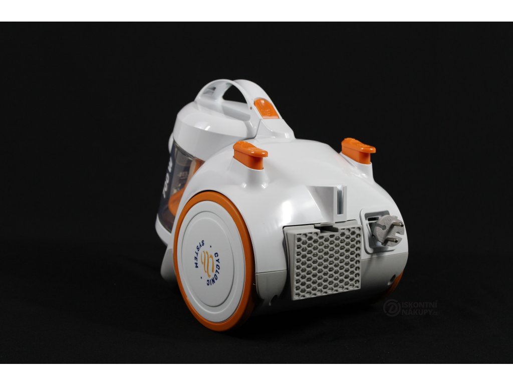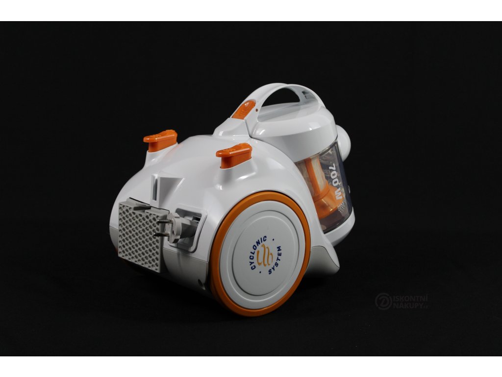 bezsáčkový vysavač • příkon 700 W • cyklonový systém vysávání • HEPA filtr • 8m akční rádius • hlučnost 80 dB • univerzální hubice • štěrbinová hubice • polštářová hubice • kartáček • 2 sací trubky • otočné přední kolečko • měkčená kolečka • automatické navíjení kabelu • objem prachové nádoby 1,5 l • hmotnost 4,2 kg