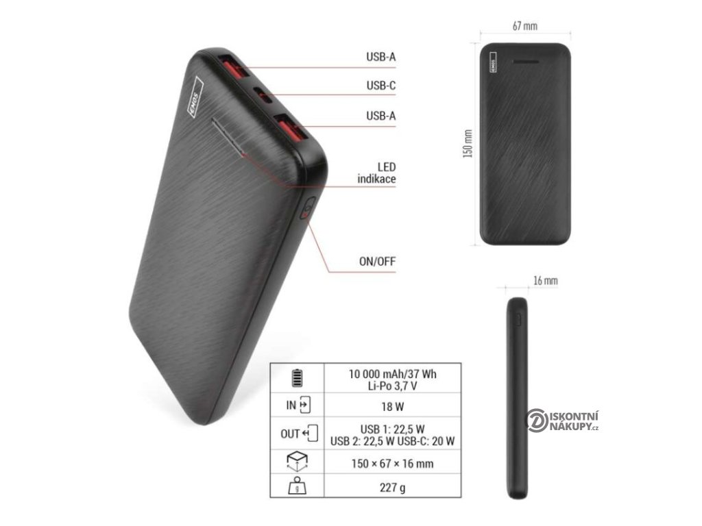 auto ON/OFF: ano|barva: černá|doba nabíjení: 3,5 hodiny|hmotnost: 227 g|kapacita akumulátoru: 10 000 mAh/37 Wh|LED indikátor nabíjení: ano|LED indikátor stavu baterie: ano|materiál: ABS plast|max. vstupní výkon: 18 W|max. výkon drátového nabíjení: 22,5 W|ochrana proti podbití: ano|ochrana proti přebití: ano|ochrana proti přetížení: ano|ochrana proti zkratu: ano|passthrough: ano|přibalený kabel: USB-A/USB-C|prodejní obal: 1 ks, plastová krabička|provozní teplota: 0 °C až +40 °C|rozměr: 150 × 67 × 16 mm|rychlé nabíjení: PD 20 W|typ akumulátoru: Li-Po 3,7 V|typ vstupního rozhraní: 1× USB-C|typ výstupního rozhraní: 2× USB-A, 1× USB-C|záruční doba: 2 rokyDoplňkové parametry