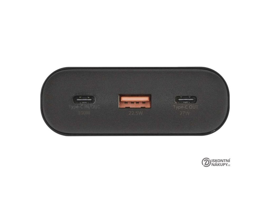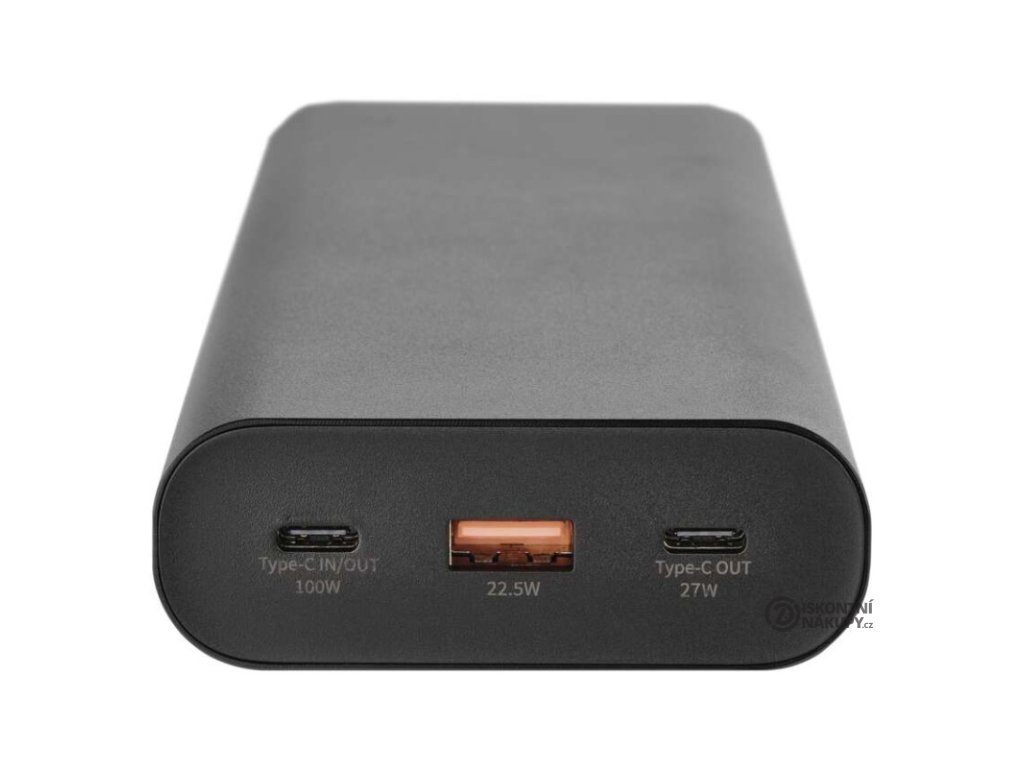 auto ON/OFF: ano|barva: černá|doba nabíjení: 2,5 hodiny|hmotnost: 580 g|kapacita akumulátoru: 27 000 mAh|LED indikátor nabíjení: ano|LED indikátor stavu baterie: ano|materiál: hliník|max. vstupní výkon: 100 W|max. výkon drátového nabíjení: 100 W|ochrana proti podbití: ano|ochrana proti přebití: ano|ochrana proti přetížení: ano|ochrana proti zkratu: ano|passthrough: ano|přibalený kabel: USB-C/USB-C|prodejní obal: 1 ks, papírová krabička|provozní teplota: 0 °C až +40 °C|rozměr: 190 × 74 × 27 mm|rychlé nabíjení: PD 100 W + PD 27 W|typ akumulátoru: Li-Ion 3,7 V|typ vstupního rozhraní: 1× USB-C|typ výstupního rozhraní: 2× USB-C, 1× USB-A|záruční doba: 2 rokyDoplňkové parametry