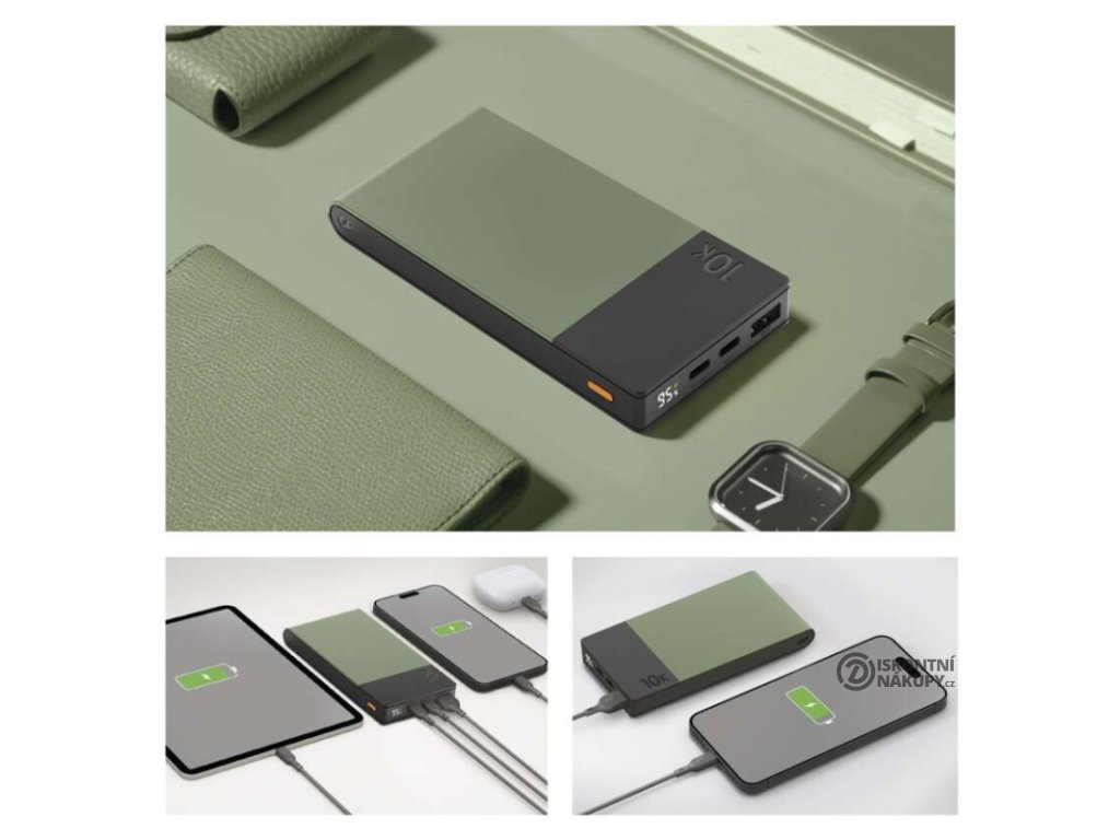 auto ON/OFF: neuvádí se|barva: zelená|doba nabíjení: 3,5 hodiny|hmotnost: 260 g|kapacita akumulátoru: 10 000 mAh/37 Wh|LED indikátor nabíjení: ano|LED indikátor stavu baterie: ano|materiál: ABS plast|max. vstupní výkon: 18 W|max. výkon drátového nabíjení: 22,5 W|ochrana proti podbití: ano|ochrana proti přebití: ano|ochrana proti přetížení: ano|ochrana proti zkratu: ano|passthrough: ano|přibalený kabel: USB-A/USB-C|prodejní obal: 1 ks, papírová krabička|provozní teplota: 0 °C až +45 °C|rozměr: 142 × 67 × 16 mm|rychlé nabíjení: PD 22,5 W|typ akumulátoru: Li-Po 3,7 V|typ vstupního rozhraní: 1× USB-C|typ výstupního rozhraní: 2× USB-C, 1× USB-A|záruční doba: 2 rokyDoplňkové parametry