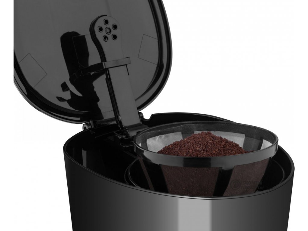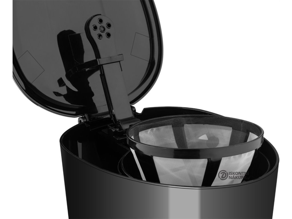 Pro přípravu 10 šálků, objem zásobníku na vodu 1,25 l, udržování stálé teploty, systém Drip-Stop, vyjímatelný a omyvatelný permanentní filtr, průhledná nádržka na vodu, automatické vypnutí, kontrolka zapnutí, snadné čištění, příslušenství: dávkovací lžička, ochrana proti přehřátí, příkon 750 W