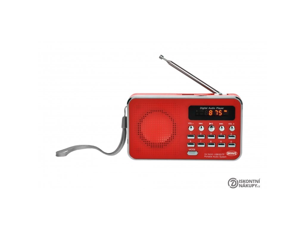 Šikovné a kompaktní digitální rádio Bravo B-6039 Sam. Vydrží až 8 hodin na jedno nabití. Disponuje USB a AUX vstupem a konektorem pro sluchátka.