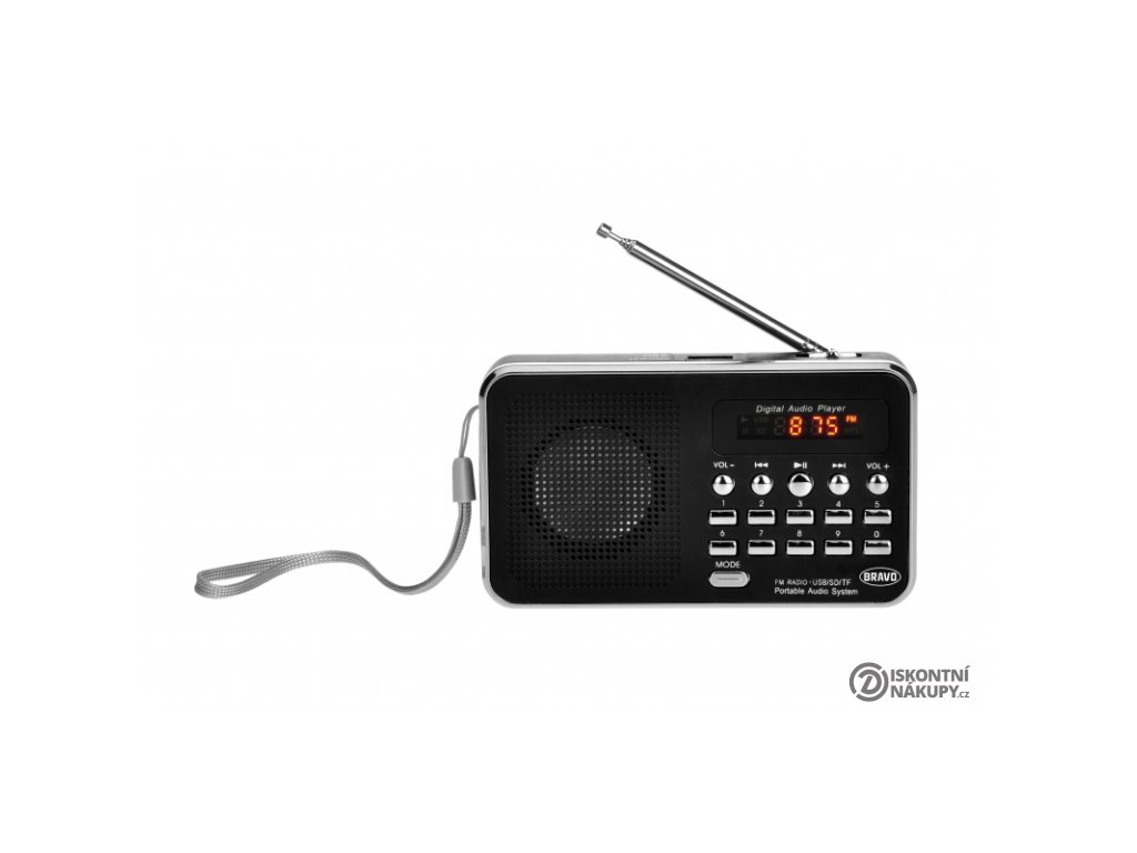 Šikovné a kompaktní digitální rádio Bravo B-6039 Sam. Vydrží až 8 hodin na jedno nabití. Disponuje USB a AUX vstupem a konektorem pro sluchátka.
