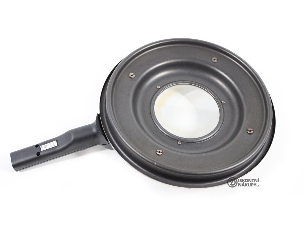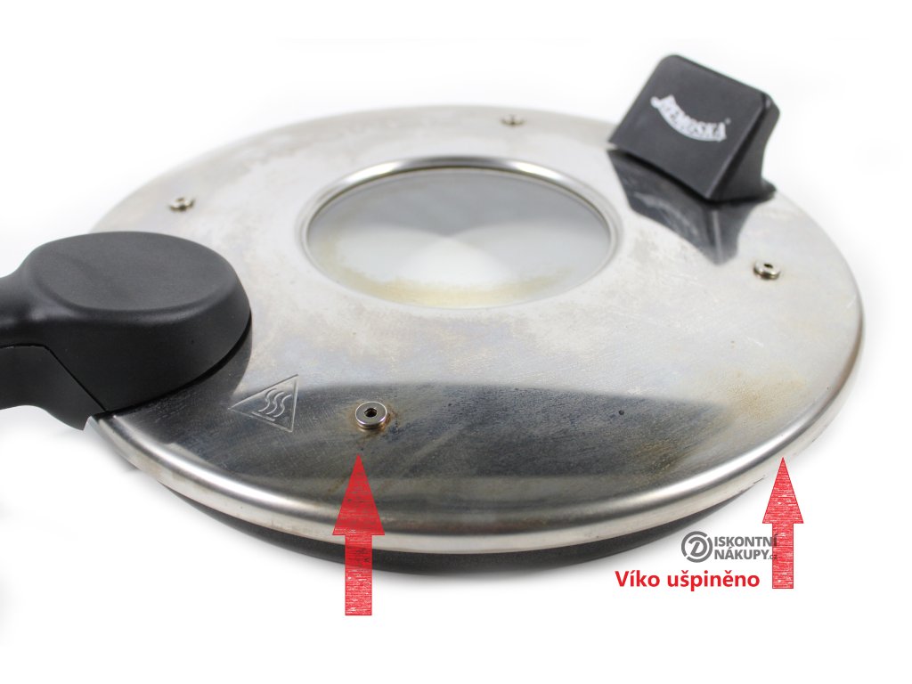 Víko s topným tělesem se skládá ze dvou částí. Spodní topná část je potažena nepřilnavým povrchem Teflon® Classic a zajišťuje dokonalé propečení vašeho jídla. Horní část je potažena nerezovým plechem a umožňuje tak odkládání pečícího víka na pracovní plochu topnou částí směrem vzhůru. Na rukojeti víka pak naleznete i ovládací spínač pečicí mísy. Víko má skleněné okénko.