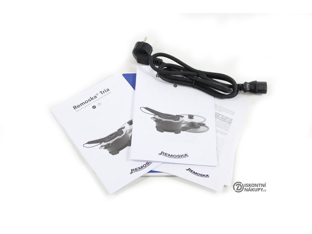 Horní část víka je vyrobena z nerezového plechu, dolní část víka je z hliníku a je potažena nepřilnavým povrchem Teflon® Classic. Přebytečná pára, vznikající při pečení, je odváděna dutými šrouby ve víku. Pečicí víko má skleněné okénko. Přívodní kabel s euro konektorem a evropskou zástrčkou je odnímatelný od držadla. Vypínač je umístěn na horní části držadla, tak aby kontrola stavu zap/vyp byla možná v jakékoliv poloze. Umístění vypínače na horní části držadla usnadňuje ovládání pro praváky i leváky. Víko je navrženo tak, aby mohlo být položeno na pracovní plochu topnou částí směrem vzhůru. V kombinaci s pečicím víkem lze multifunkční Remosku Tria použít k přípravě pokrmů pečením a zapékáním.